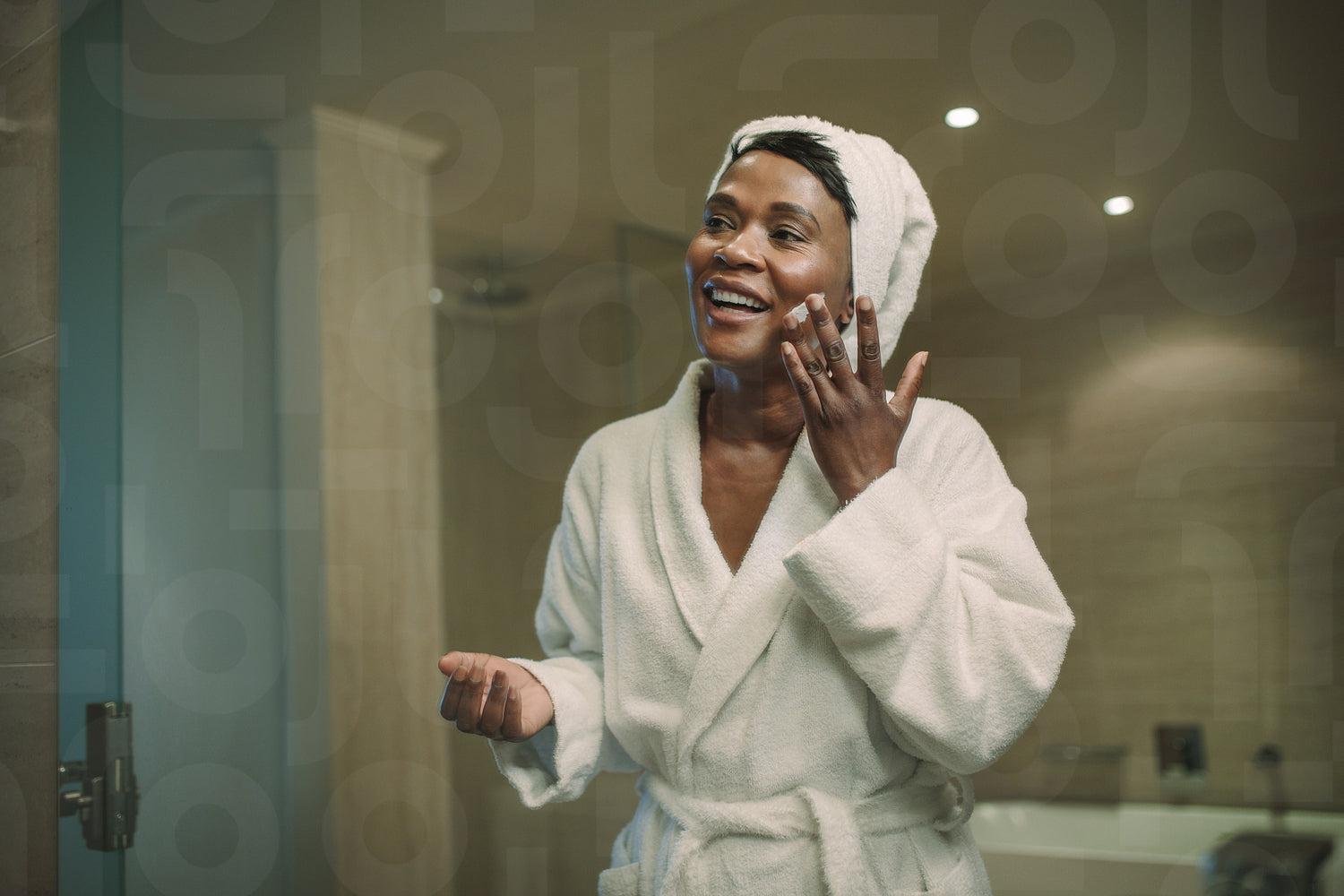 Smiling african woman applying cosmetic cream on face standing in the bathroom. Reflection in mirror of female putting body lotion cream on her face.