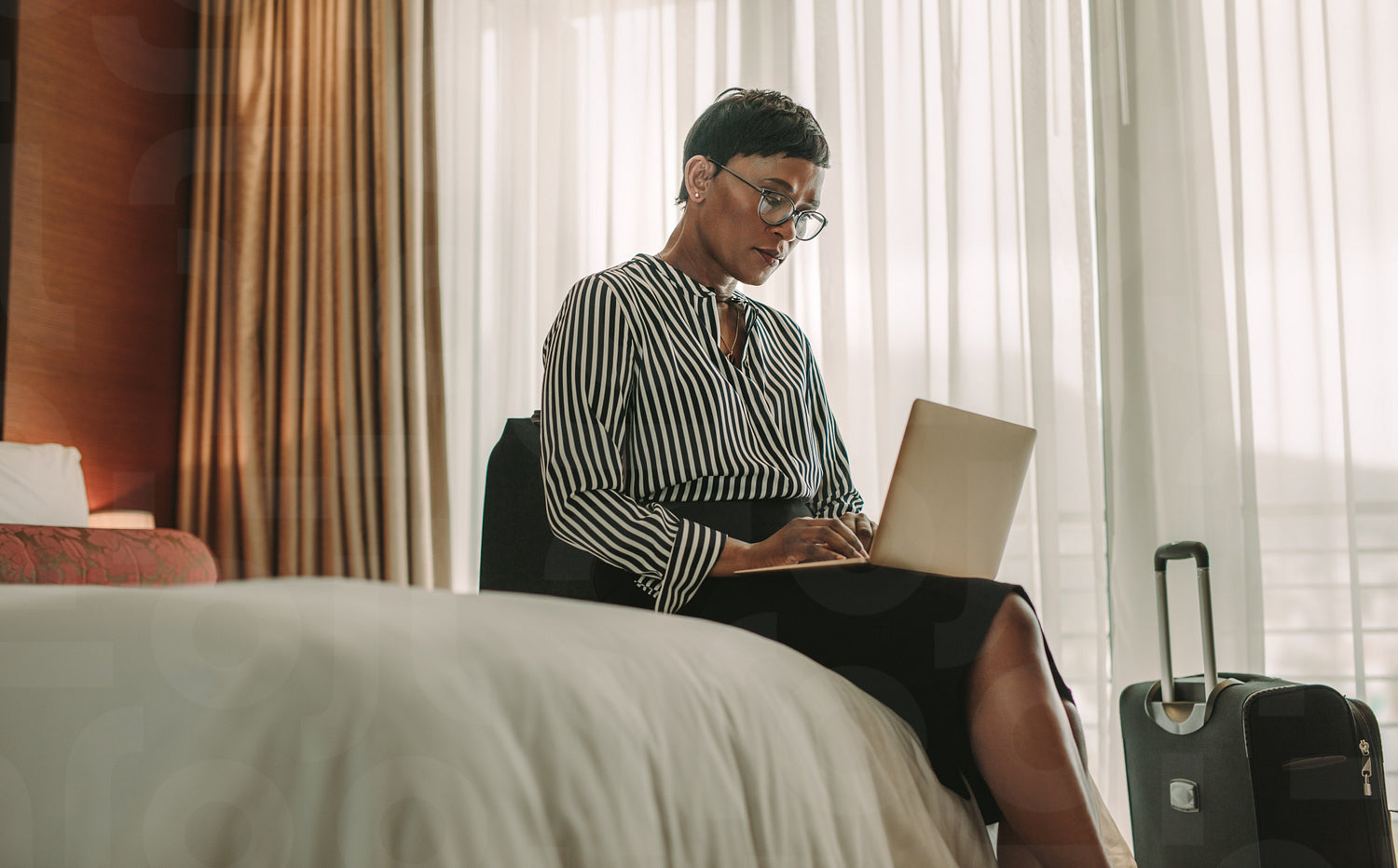 Businesswoman sitting on bed using laptop. African woman on business trip working in hotel room.