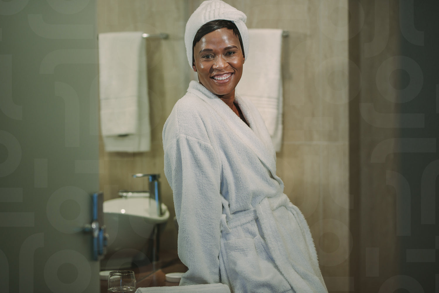 Portrait of mature african woman standing in bathroom with glowing skin. Female in bathrobe leaning to bathroom sink and looking at camera smiling.