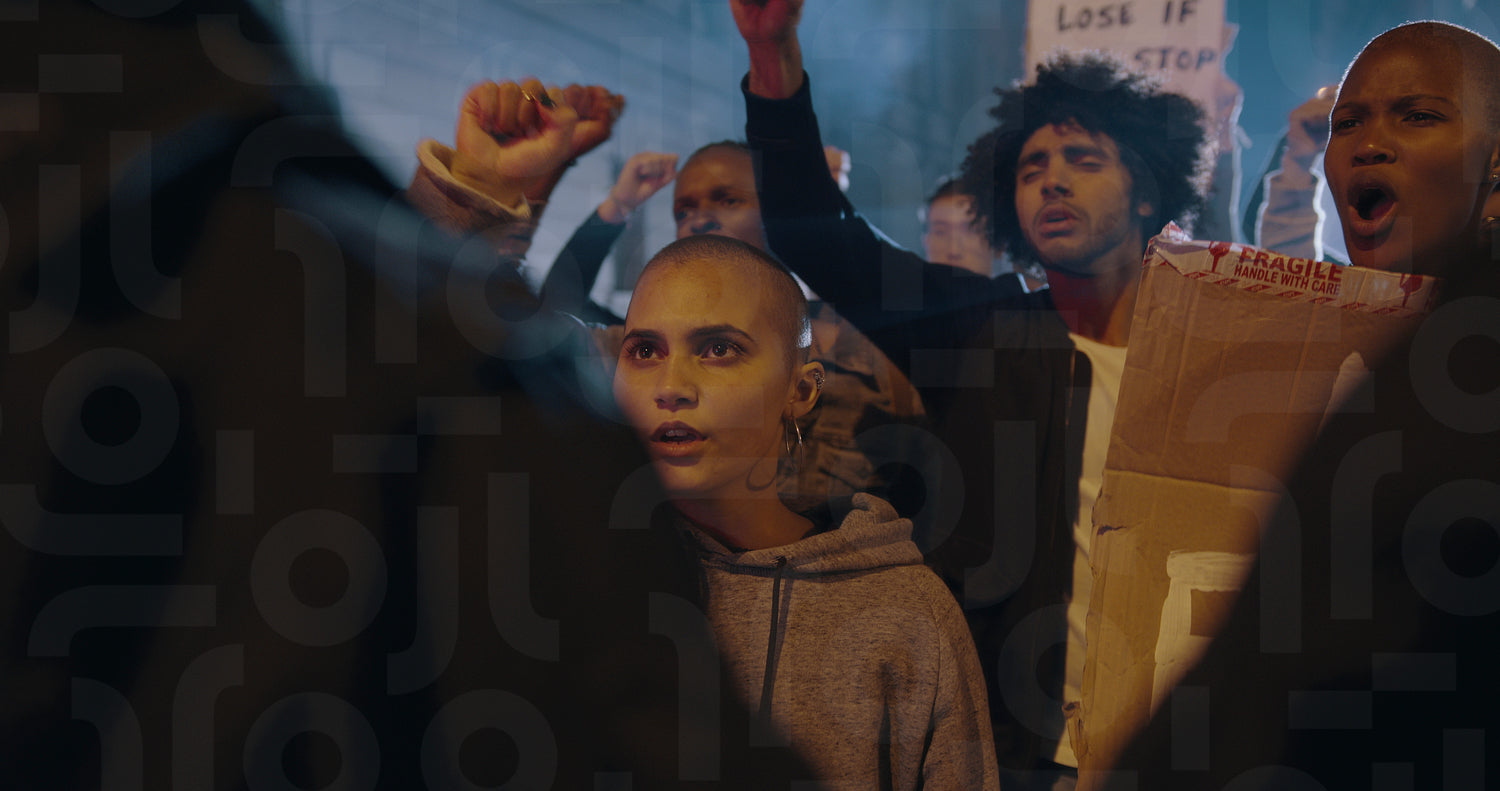 Group of furious protestors giving slogans in front of police force. Group of men and women demonstrating against police violence at night.