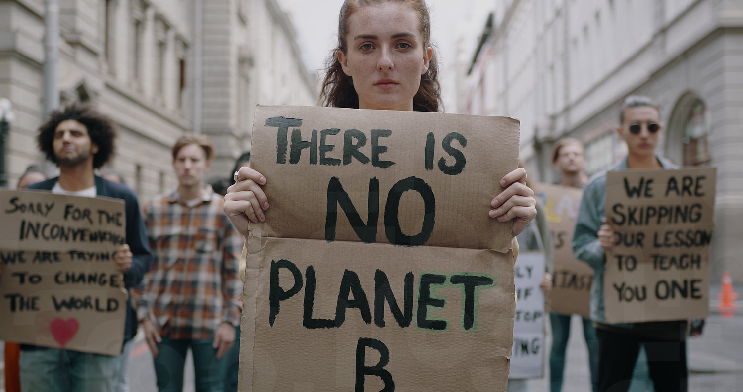 Group of protestors on the streets with posters. Activists protesting against pollution and global warming.