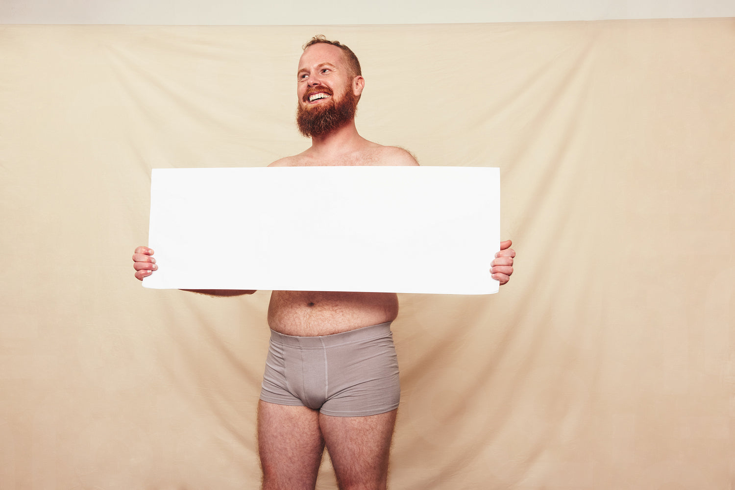 Advocating for body positivity and natural bodies. Happy shirtless man smiling cheerfully while displaying a blank white placard in a studio. Self-confident man standing in grey underwear.