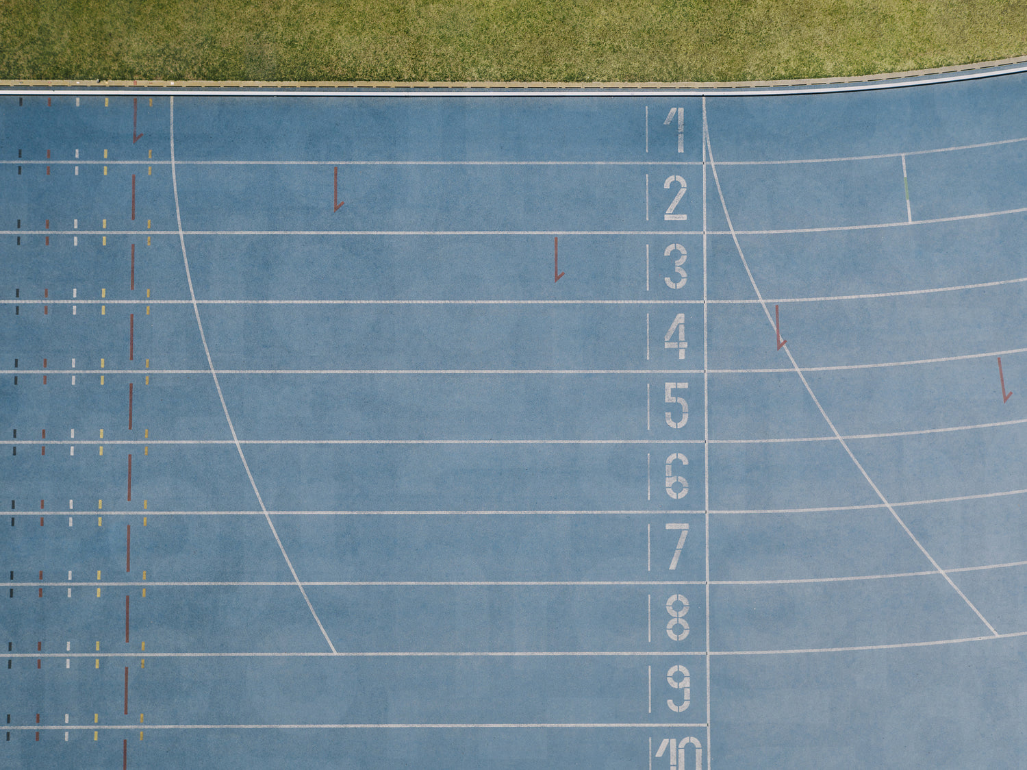 Aerial view of finish line of an athletic track. Top view of blue all-weather running track in a stadium.