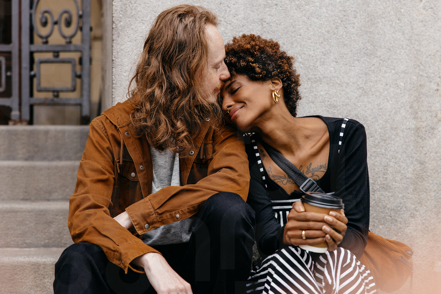 A young couple sits closely on the steps, embracing and sharing a tender moment. The urban background provides a relaxed atmosphere for their spontaneous display of affection, highlighting the concept of love in everyday settings.