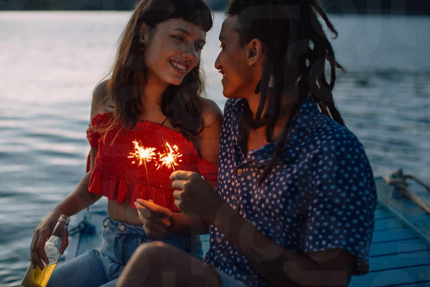 Affectionate young interracial couple celebrating a moment together during a vacation. Two romantic lovers smiling at each other while sitting together and holding Bengal lights at the sea.