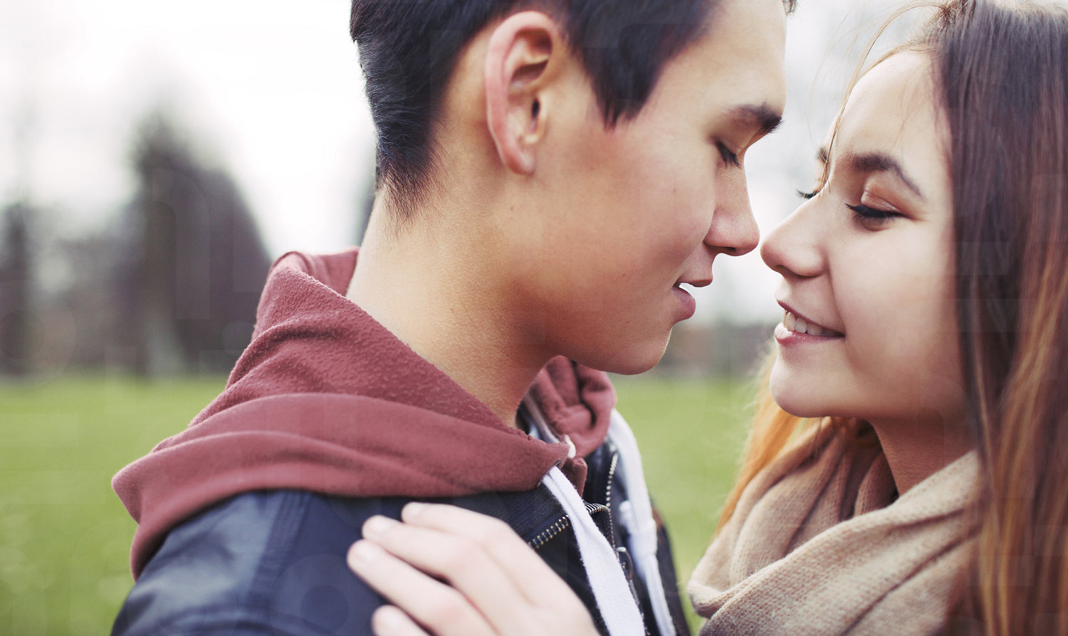 Close up image of romantic young couple in park. Asian teenage couple about to kiss each other while outdoors on a date.