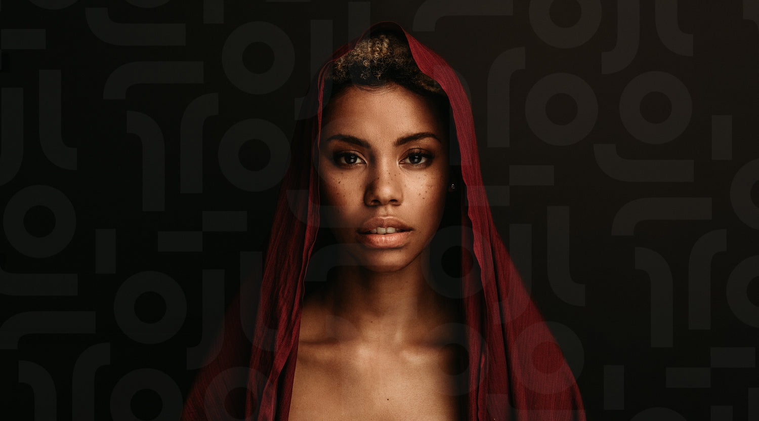 Portrait of african american woman on black background. Woman wearing maroon fabric on head isolated on black background.