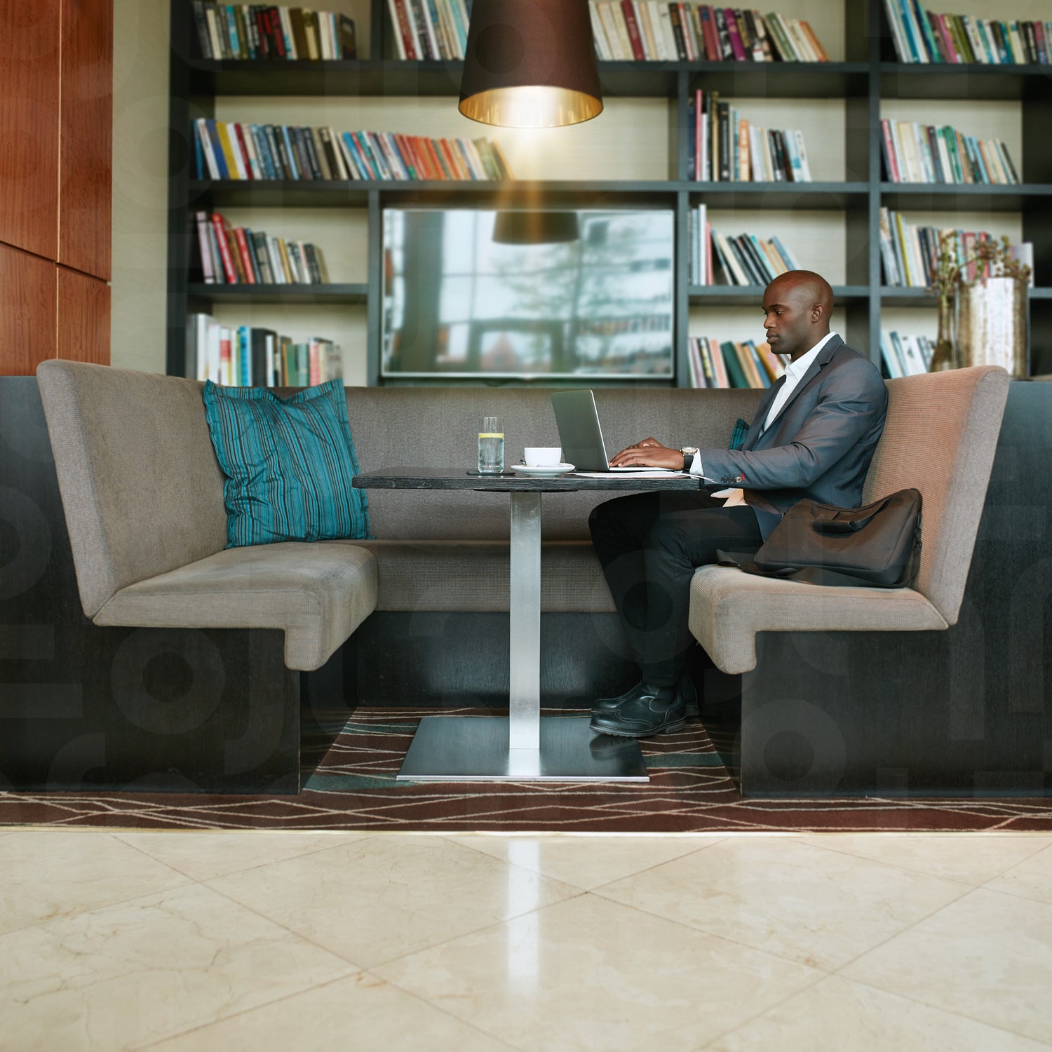 Shot of young african businessman sitting alone at coffee shop working on his laptop. Waiting for client for a meeting.