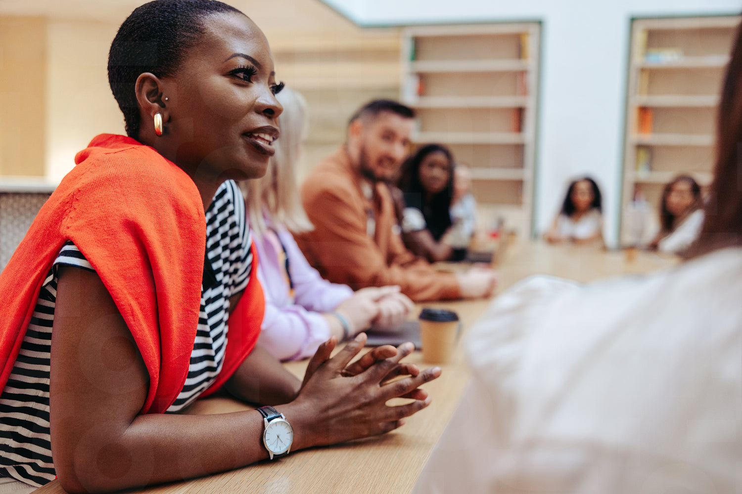 African businesswoman leads a diverse group discussion during a business meeting