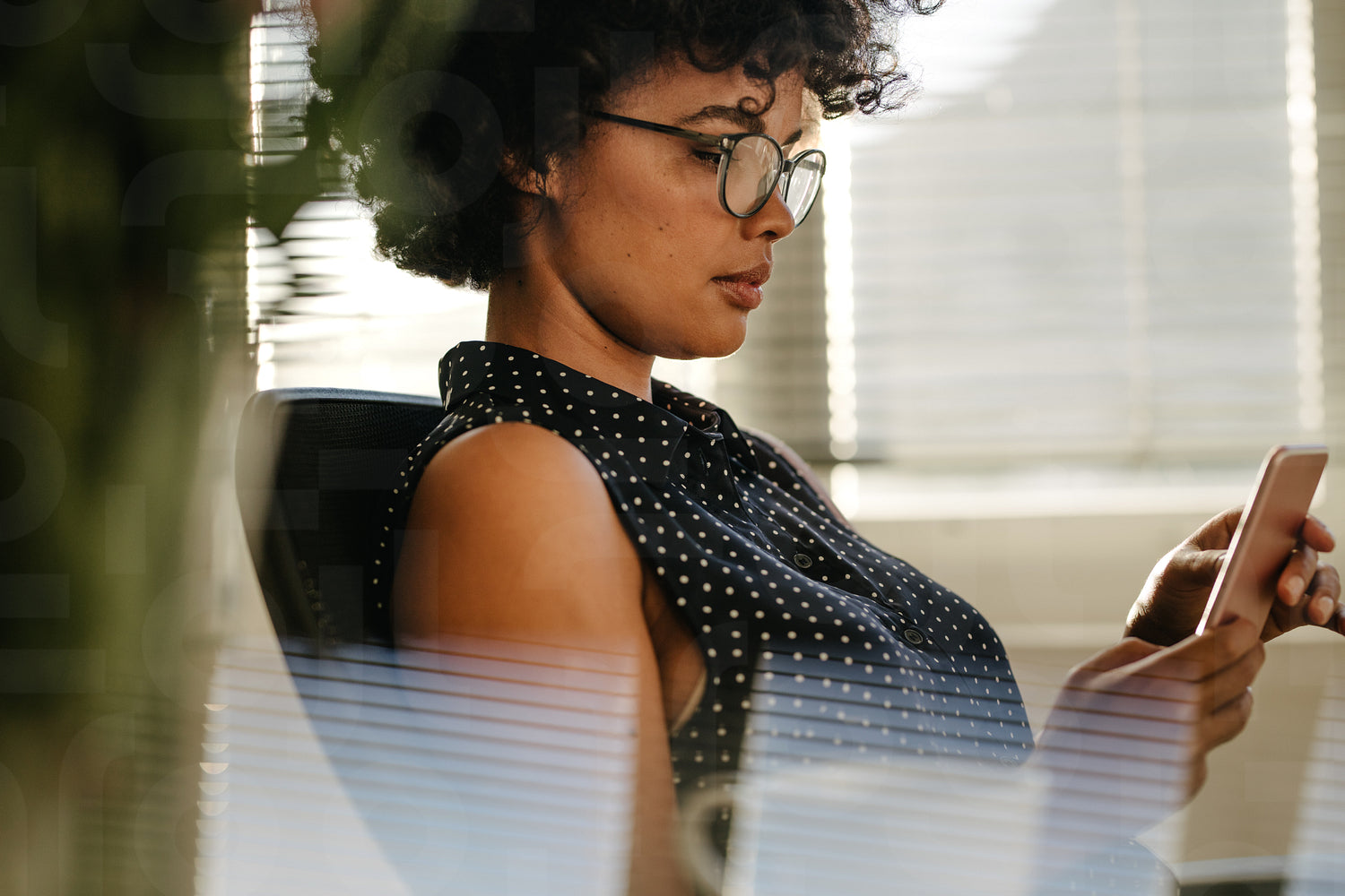 Close up of young african woman using mobile phone in office. Female in casuals sitting at her desk using smartphone.