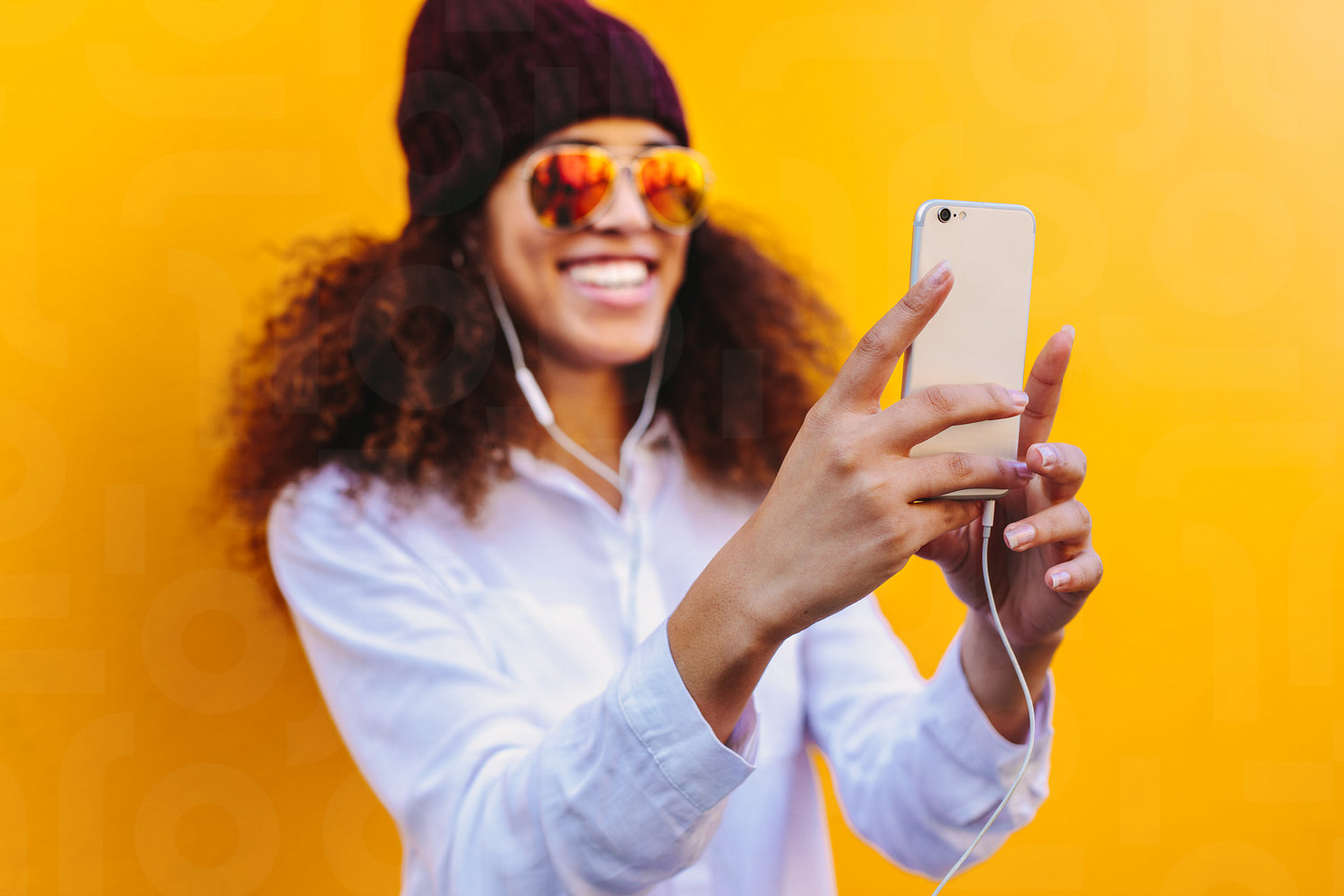 African girl taking a selfie using mobile phone. Focus on mobile phone in hand of female taking selfie on yellow background.
