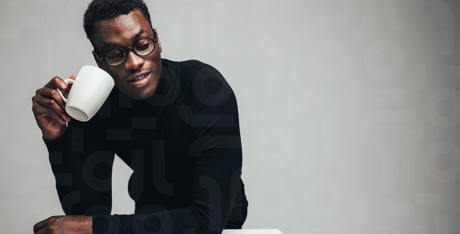 African man having a cup of coffee. Relaxed young man drinking coffee against gray background.