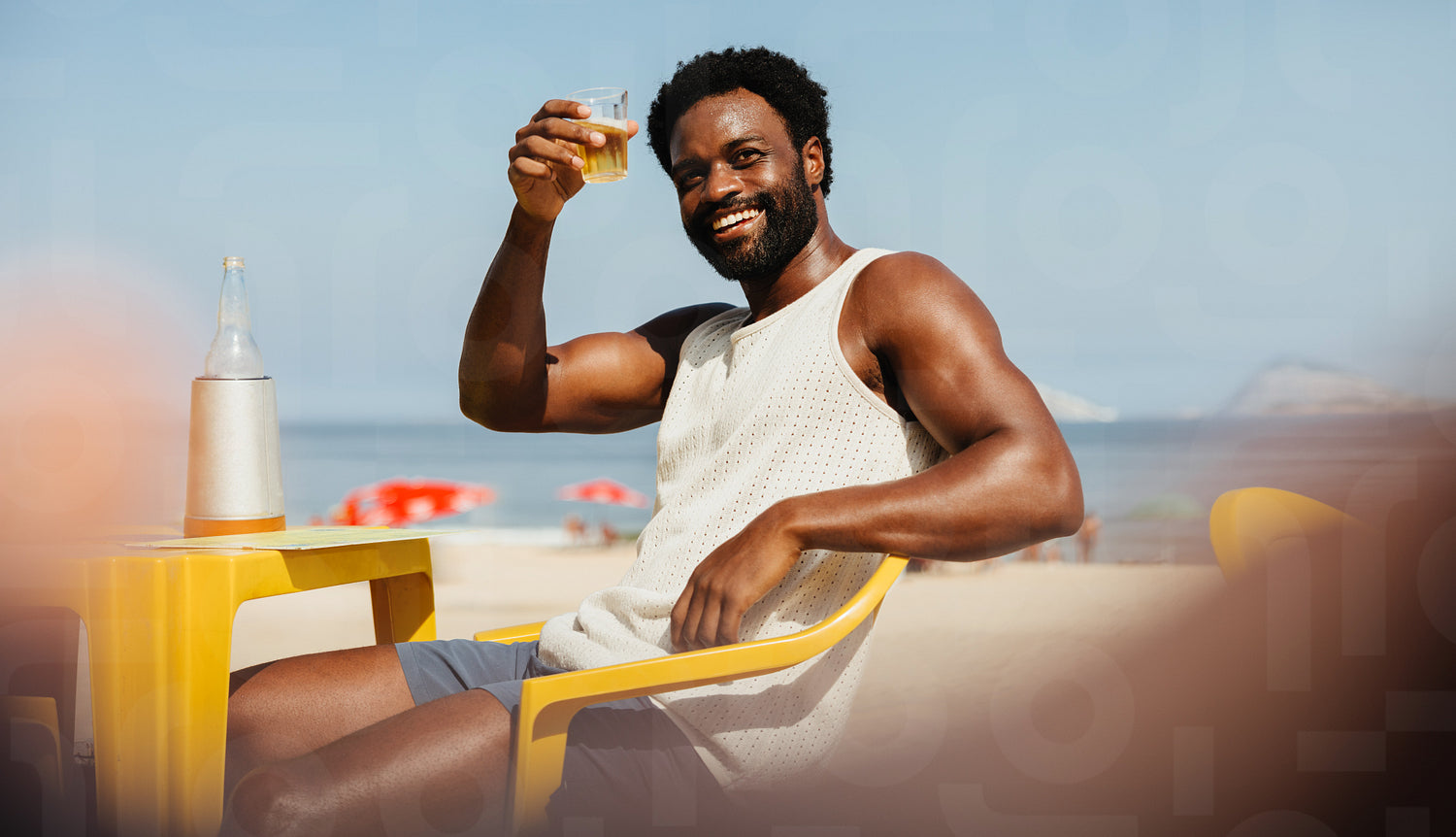 A cheerful African man sits on a sunny beach, raising a glass in celebration. Dressed casually in a tank top and shorts, he enjoys the warm weather and relaxed atmosphere.