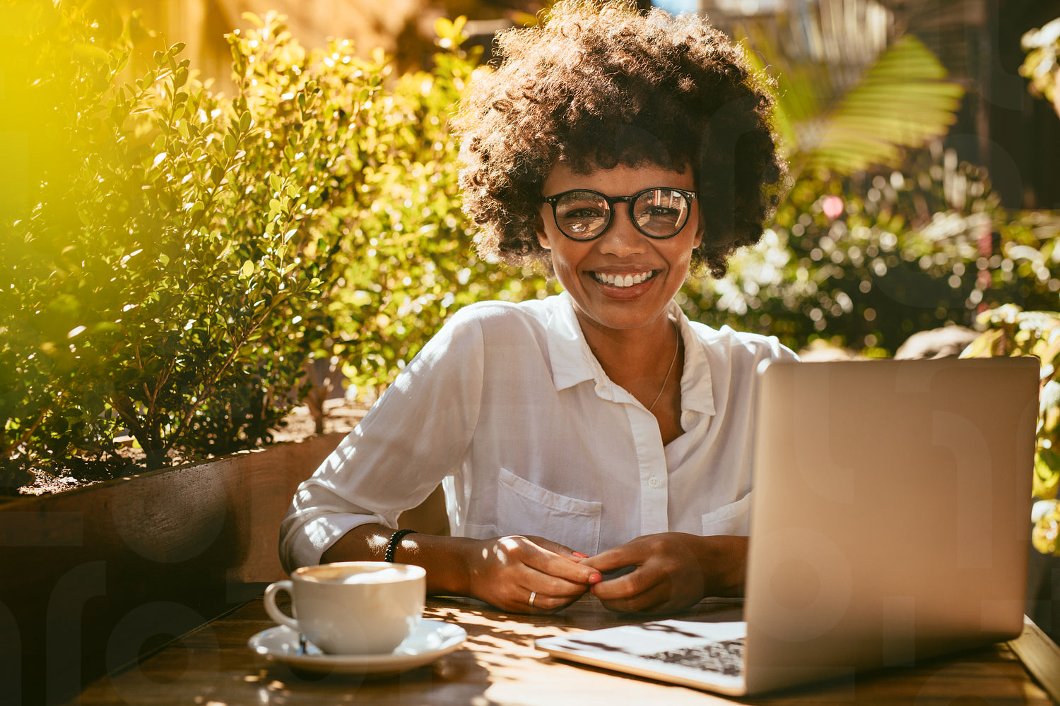 Young african woman sitting at cafe table with laptop and cup of coffee. Female with eyeglasses at coffee shop looking at camera and smiling.