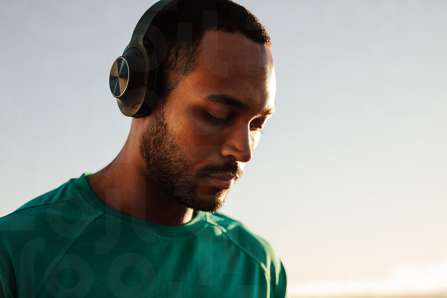 Portrait of an african american athlete wearing a wireless headphones. Close up of a fitness man standing outdoors listening to music.