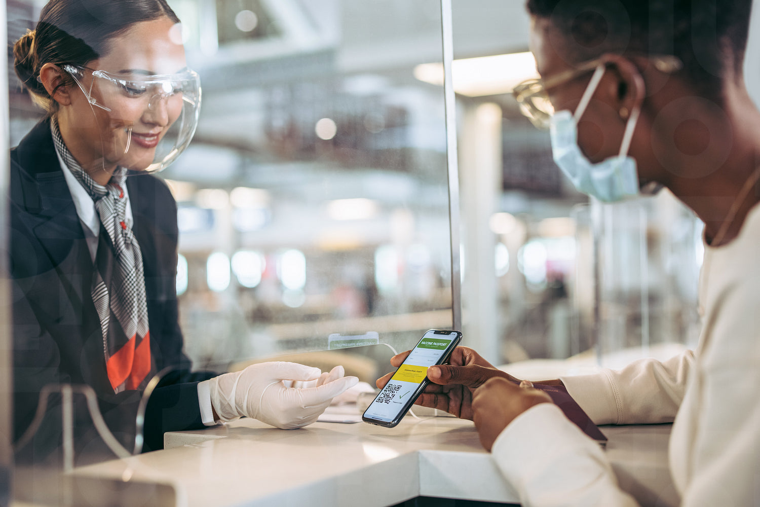 Airport staff checking vaccine passport of passenger