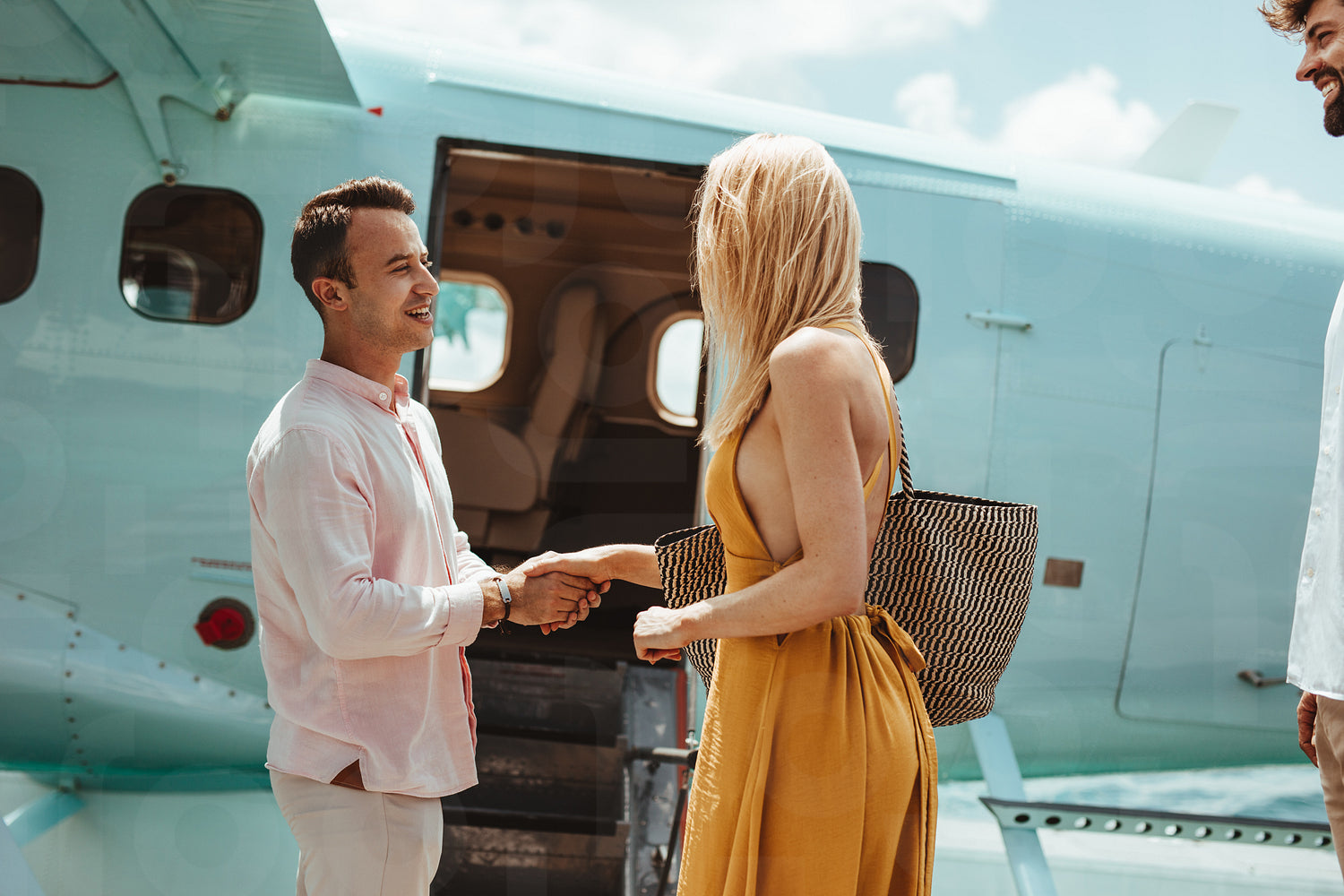 Person greeting tourists at a tourist destination. Man shaking hands with a female tourist while boarding an airplane.