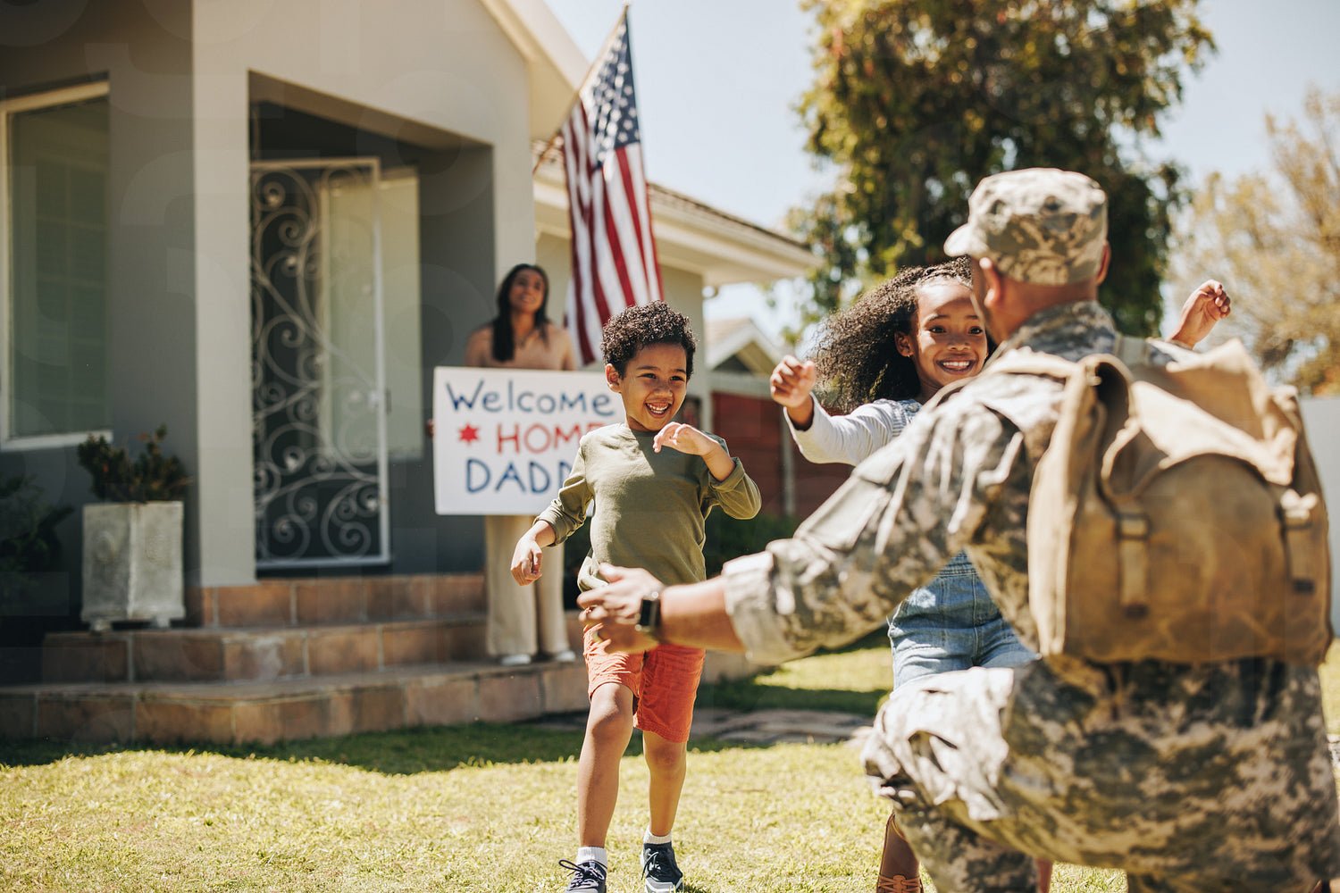 American soldier receiving a warm welcome from his family. Military man embracing his children after coming back home from the army. Serviceman reuniting with his family after deployment.