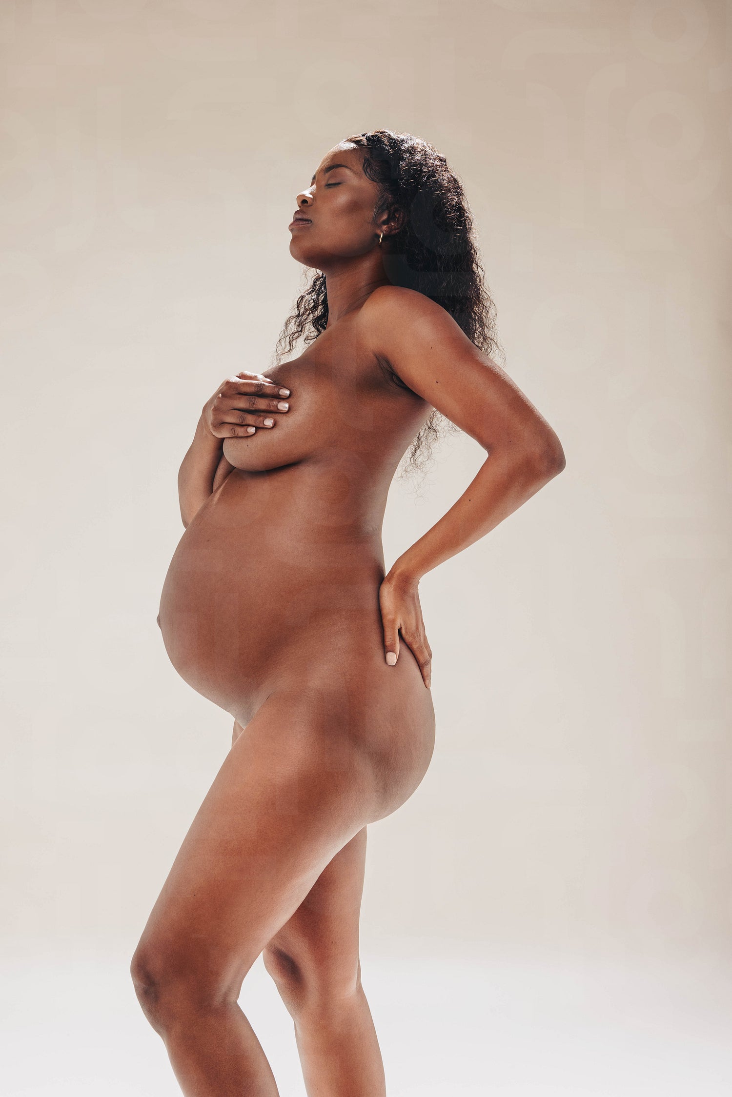 Confident black woman proudly displays her baby bump during the third trimester of her pregnancy. Celebrating body positivity and motherhood, she stands nude, embracing her beautiful melanin.