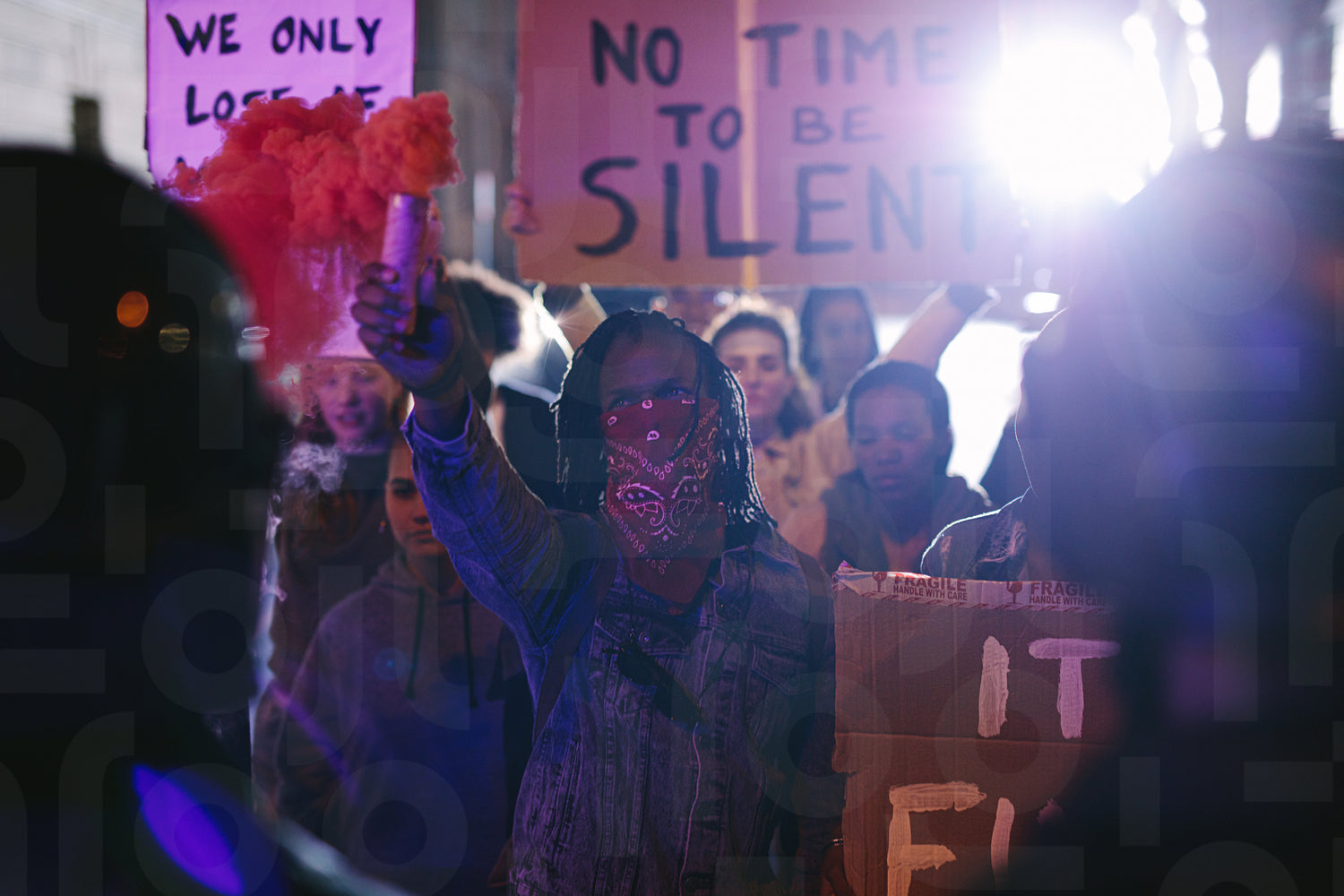 Protestors demonstrating with smoke grenades in front of the security force at night. Anti-government protest by the social activist group.