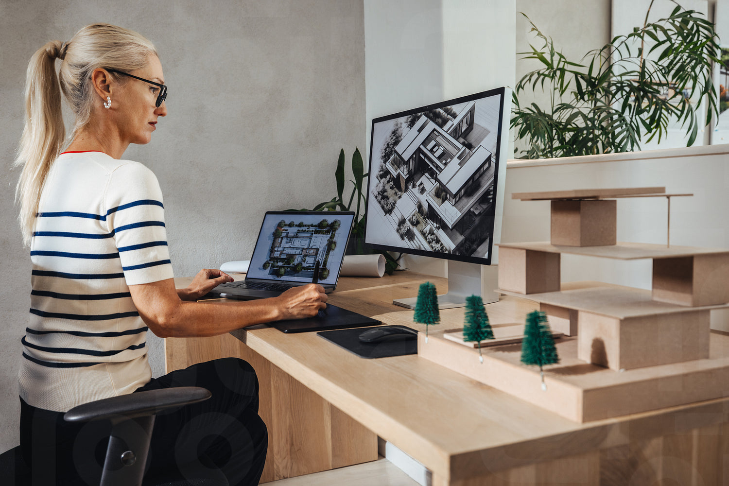 Female architect analyzing building designs on a computer screen and using physical models for visualization. A professional design workspace with modern tools and creative architectural concepts.