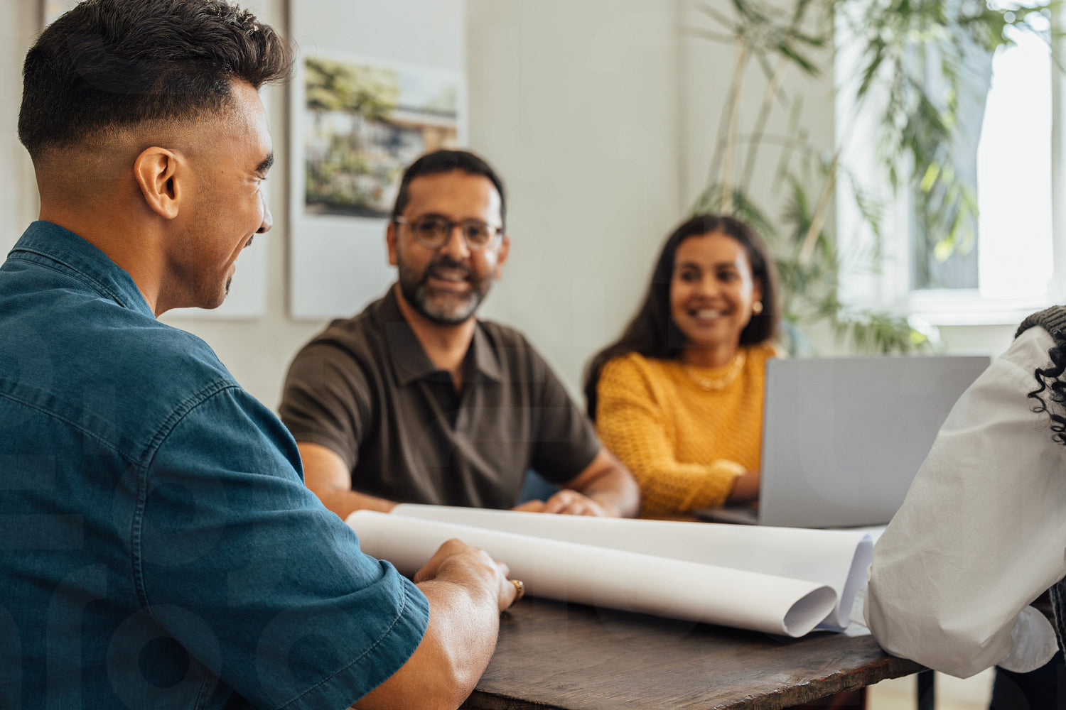 Architects brainstorming design ideas in a modern workspace with a teamwork focus