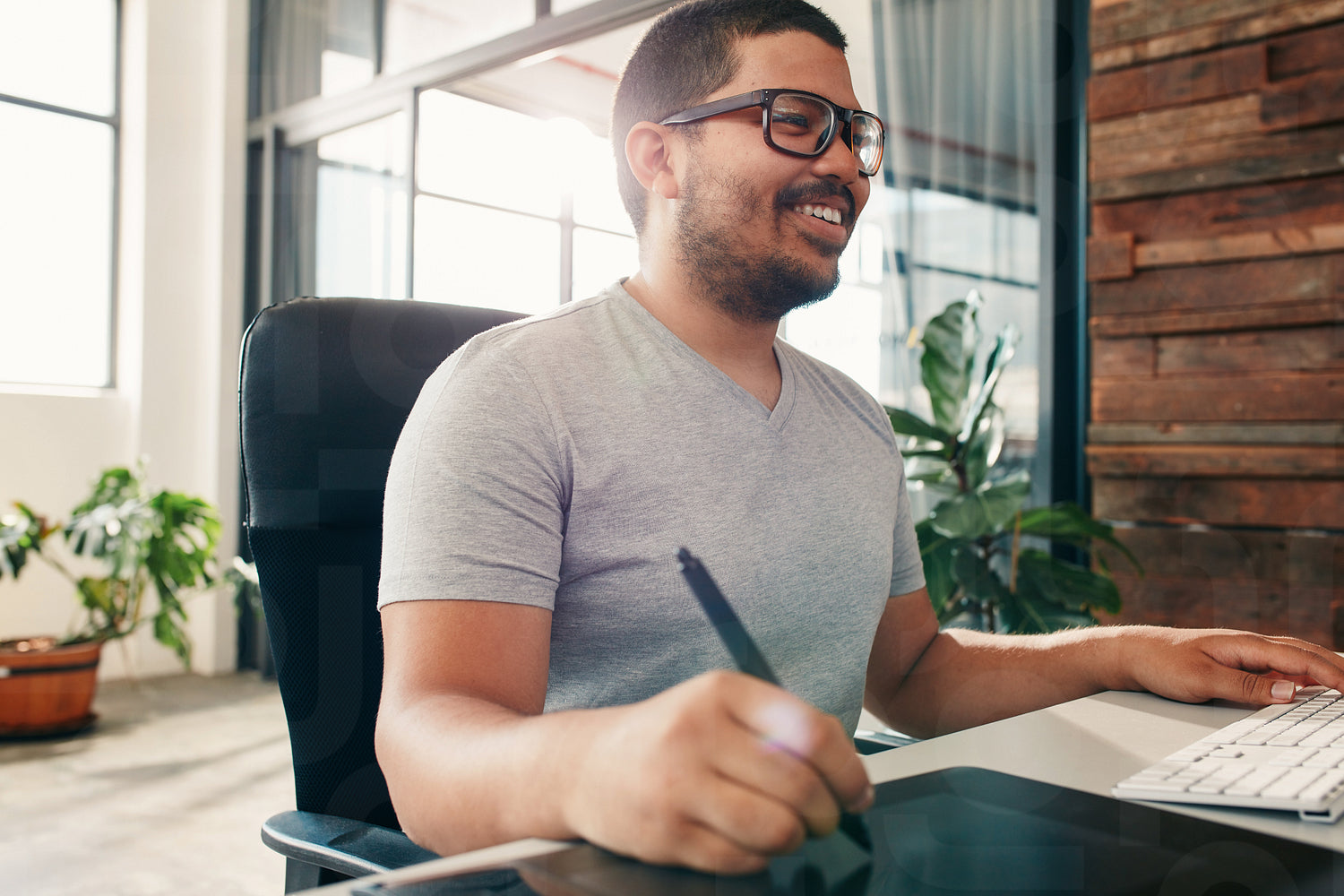 Happy young male designer working on graphics tablet using a stylus. Artist using new technology for editing his artwork.