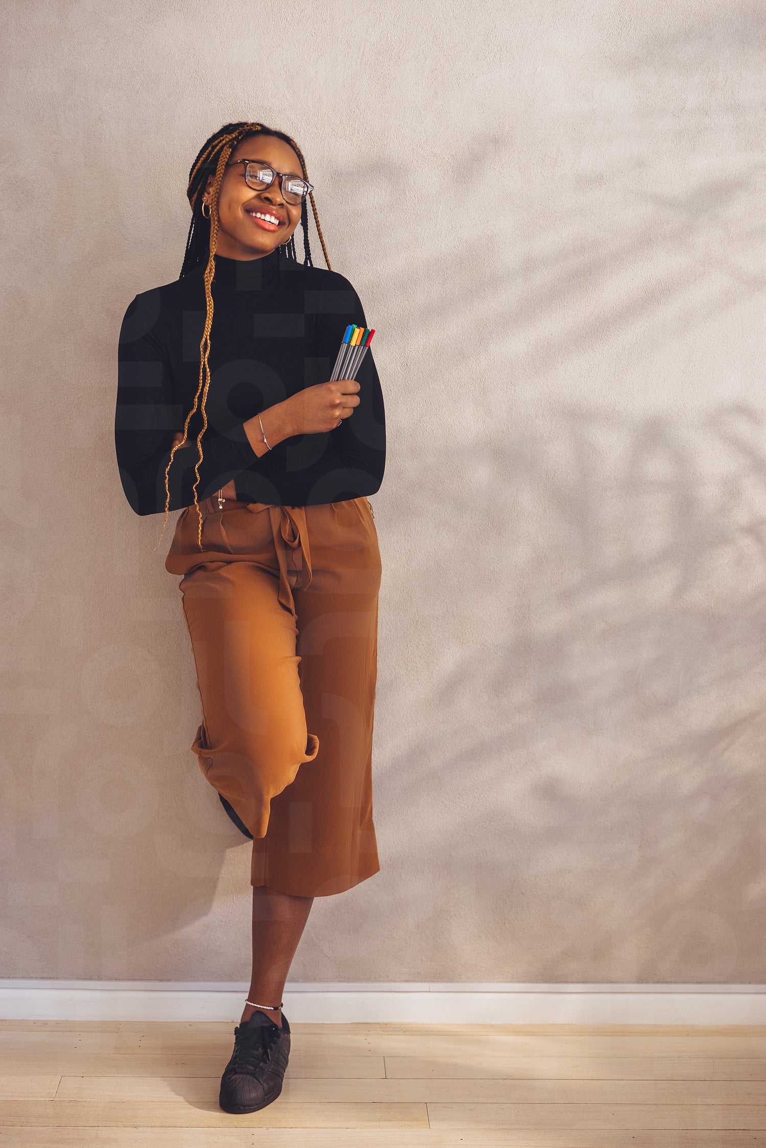 Artistic female freelancer standing against a wall in her creative home office. Happy young graphic designer smiling cheerfully while holding coloured pencils in her hand.