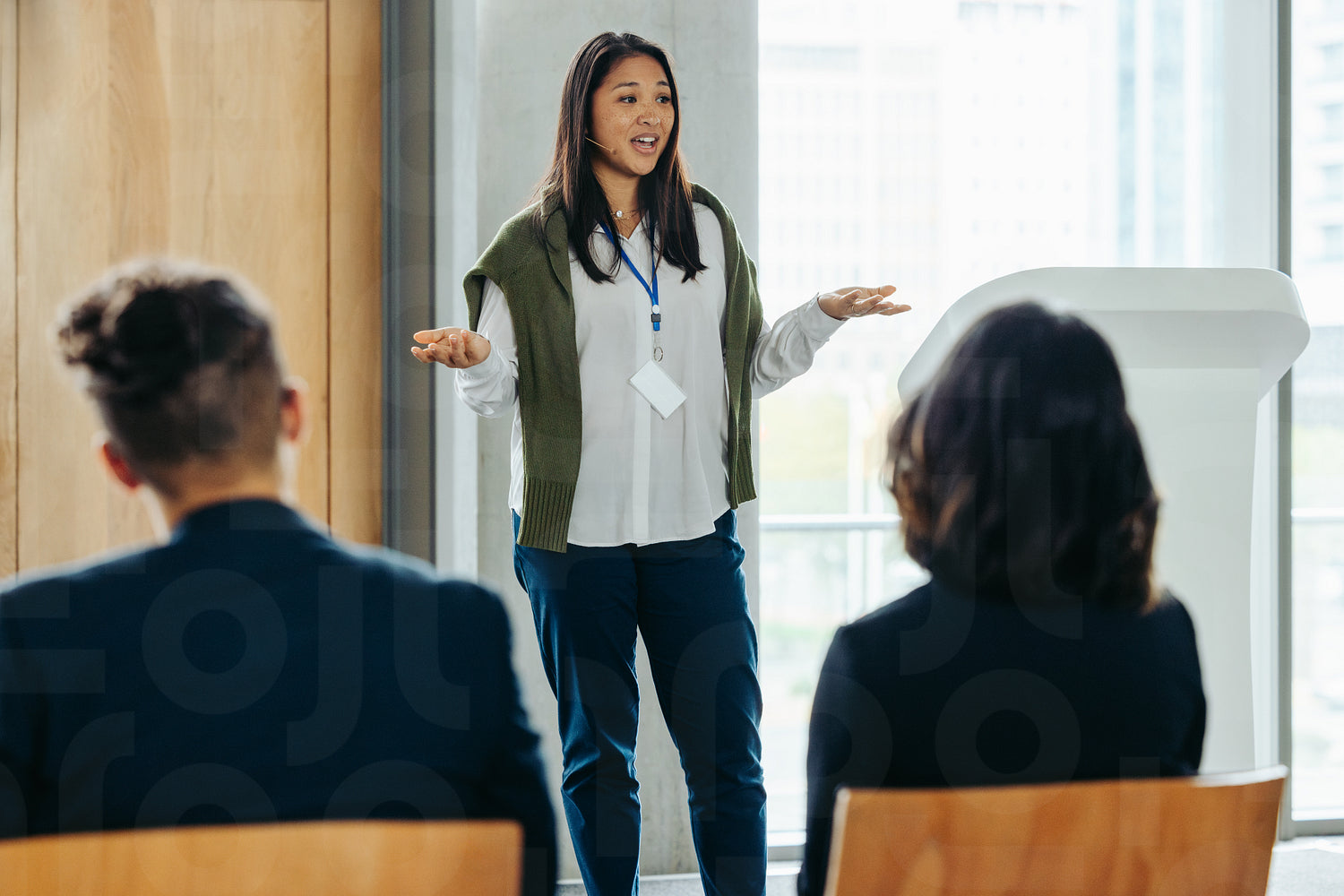 Asian businesswoman giving a speech at a conference, demonstrating leadership and communication skills to a diverse audience during an event.