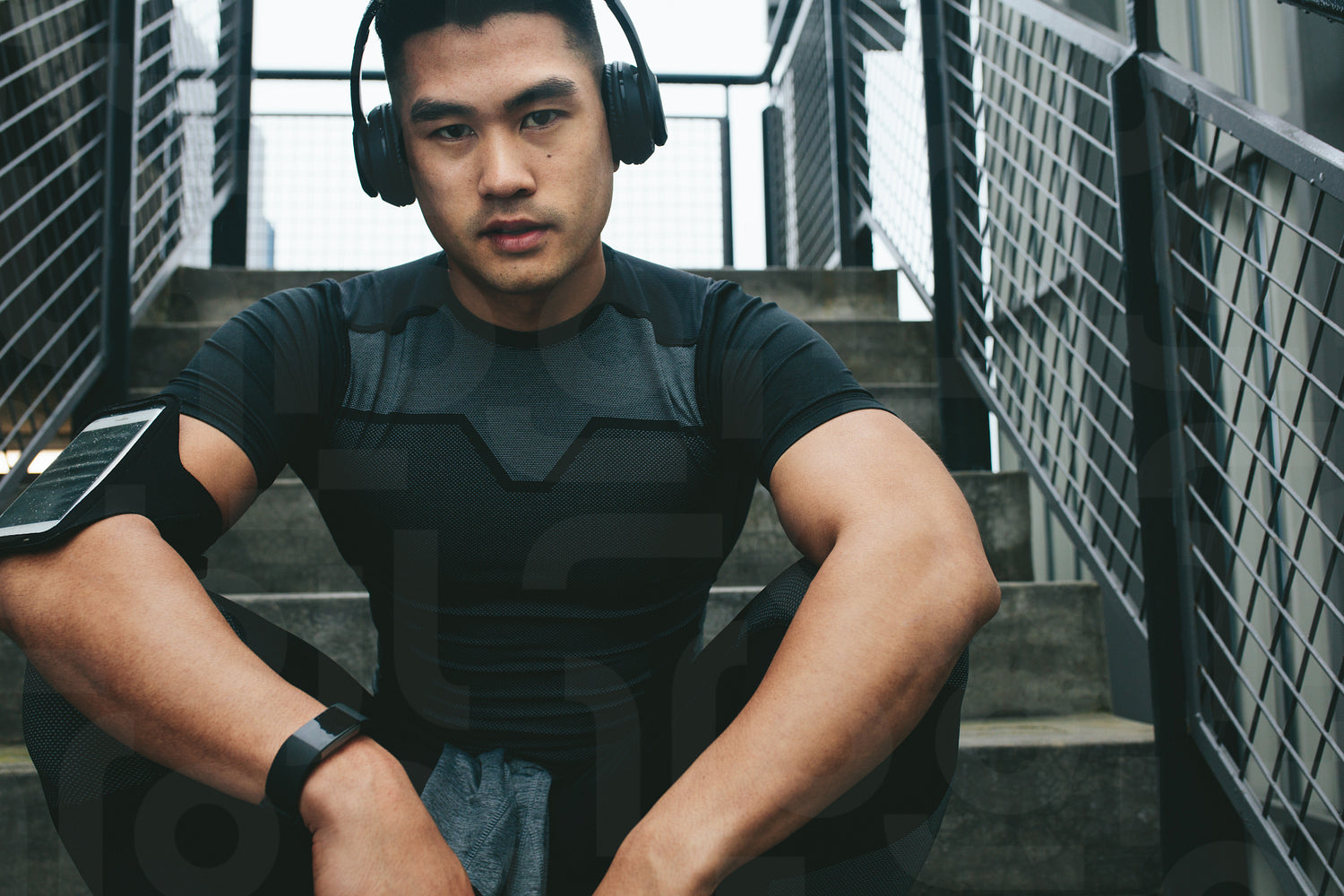 Portrait of asian man relaxing after workout sitting outdoors on stairs. Male athlete listening to music using wireless headphones while relaxing after training session.