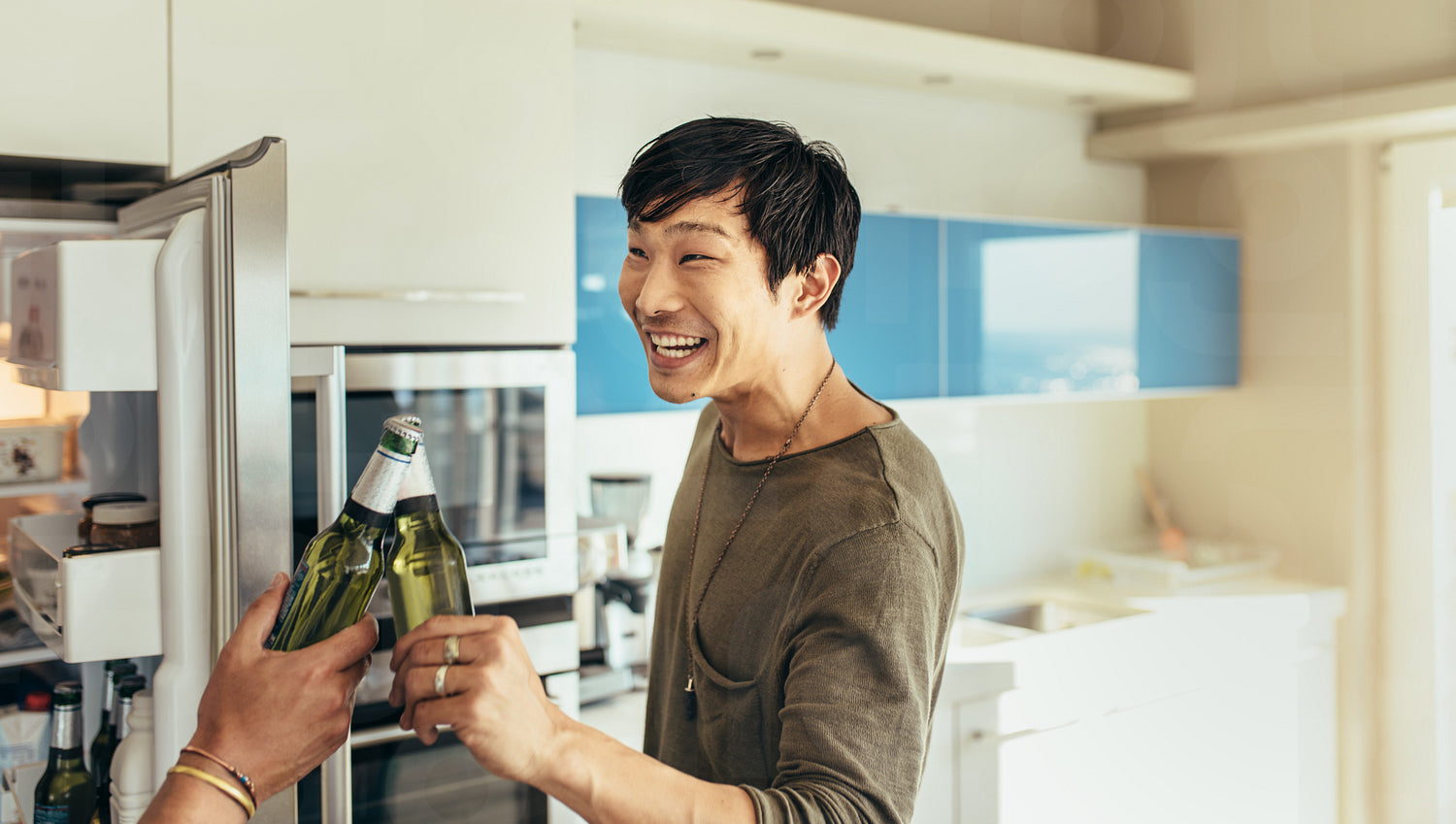 Smiling asian man standing at home toasting a bottle of beer with his friend. Friends having a party at home with beer bottles.