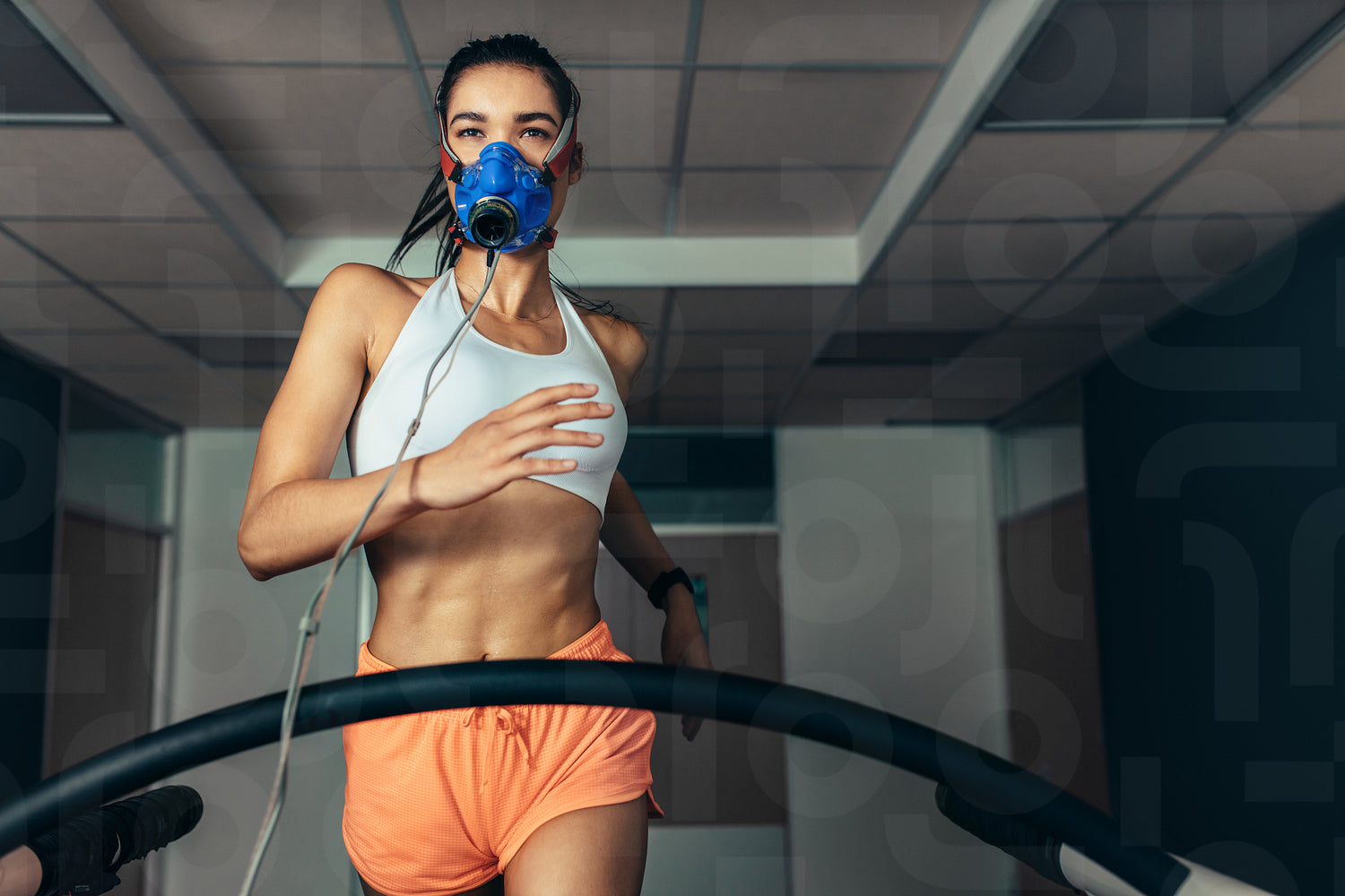 Fit woman running on treadmill with a mask. Athlete examining her performance in biomechanics lab.