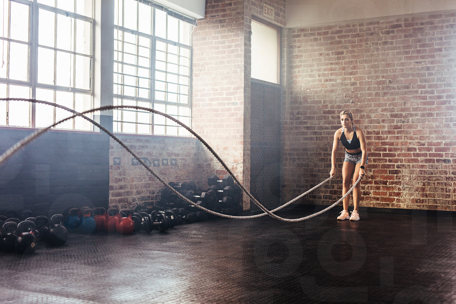 Woman using training ropes for exercise at the gym. Athlete moving the ropes in wave motion as part of strength training.
