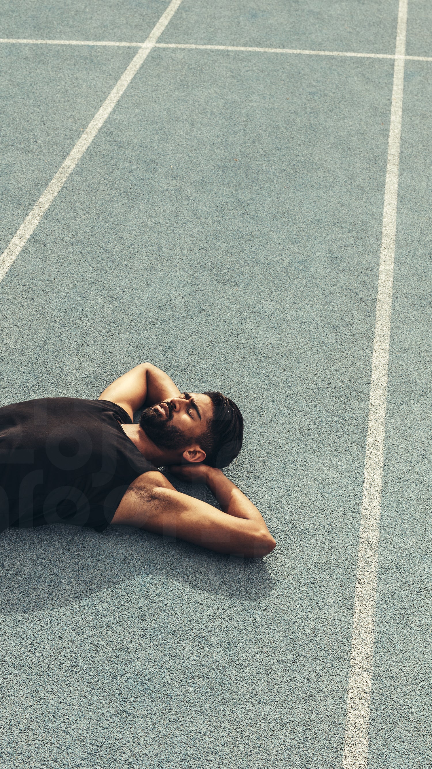 Runner lying on the track in a relaxed mood with hands under his head. Top view of an athlete relaxing after a run.