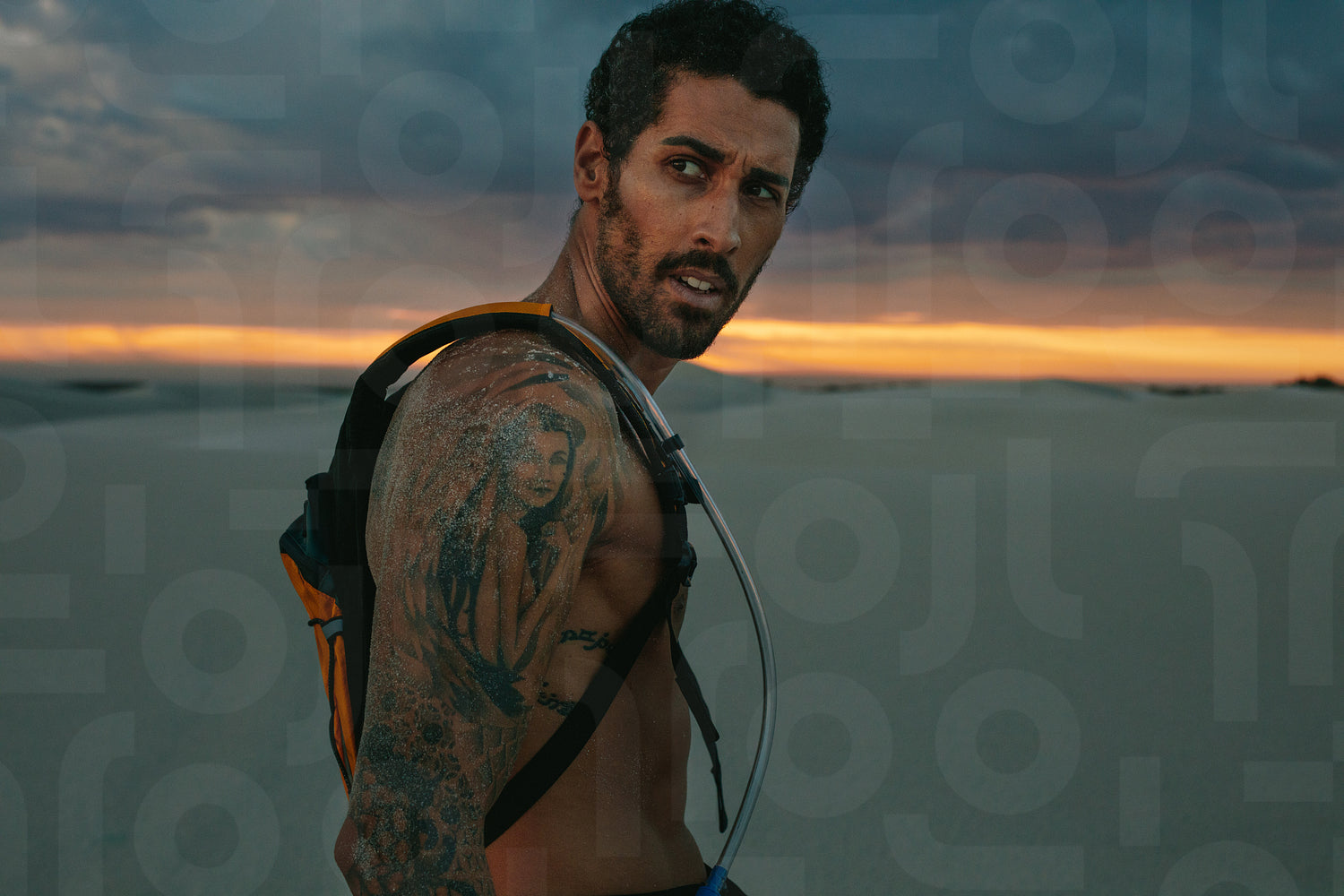 Fit young man in desert during sunset. Male athlete in desert with hydration pack looking away.