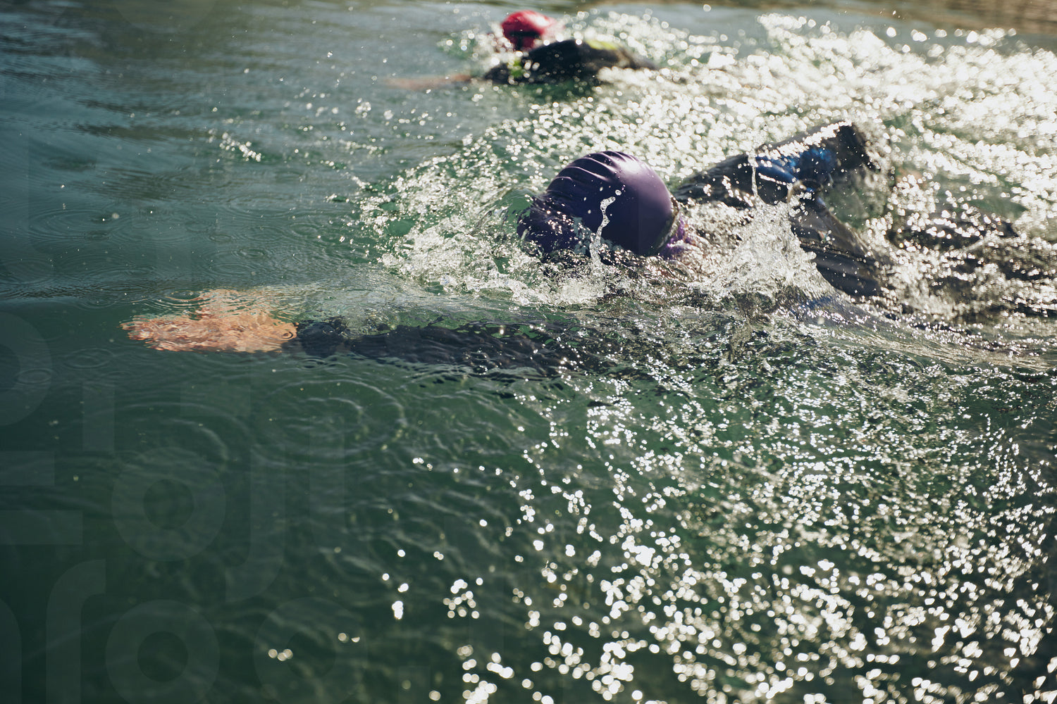 Athletes swimming in a competition. Open water swimming, athletes swimming long distance.