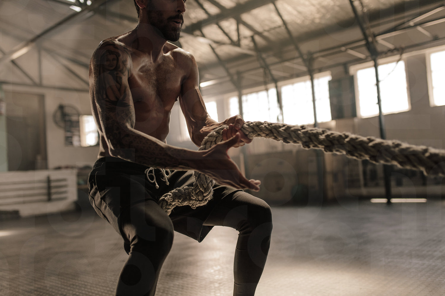 Athletic man with great physique pulling rope. Strong man pulling heavy rope at cross training gym.