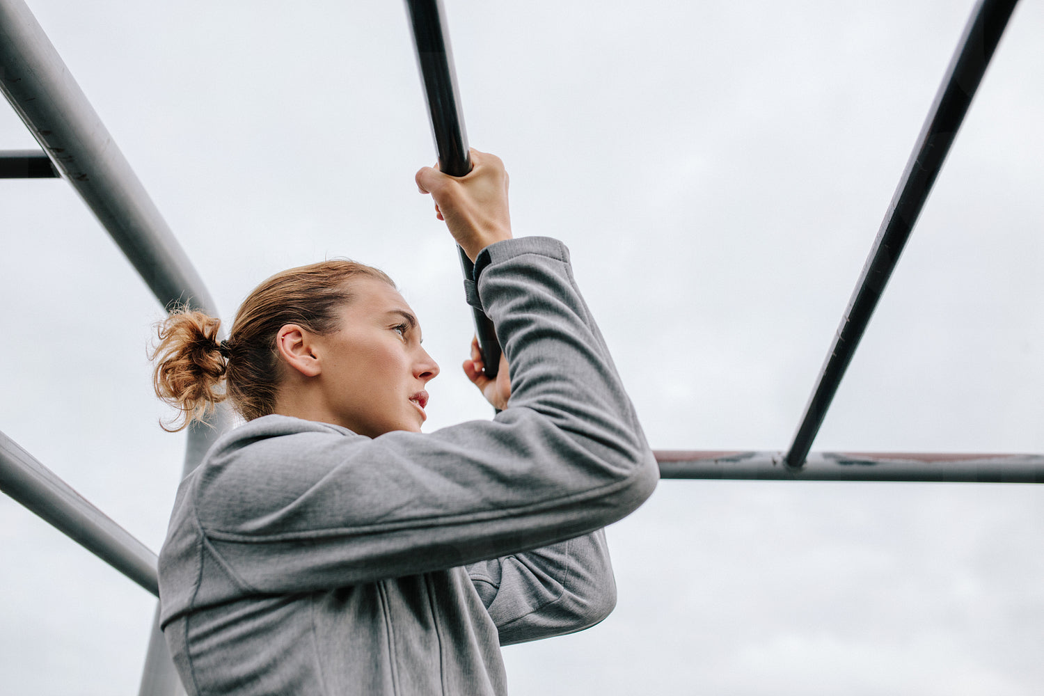 Young athletic woman doing exercises outdoor on fitness equipments. Fit woman climbing monkey bars during obstacle course in fitness training.
