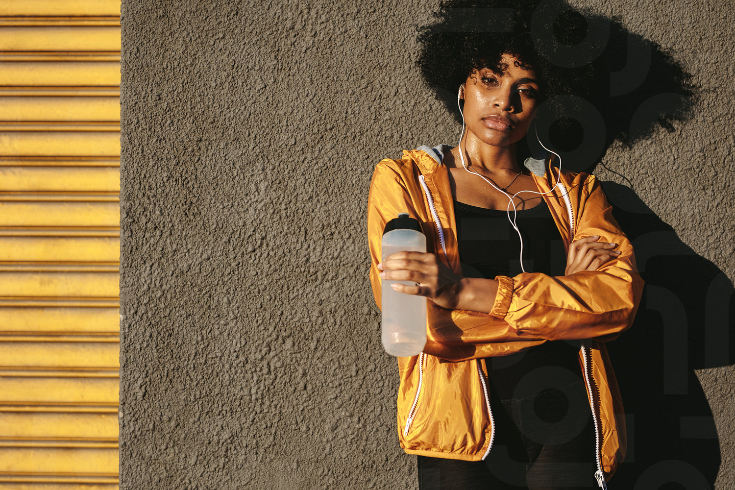 African american woman in fitness wear taking a break from workout standing with a water bottle in hand. Athletic woman taking a break during workout.