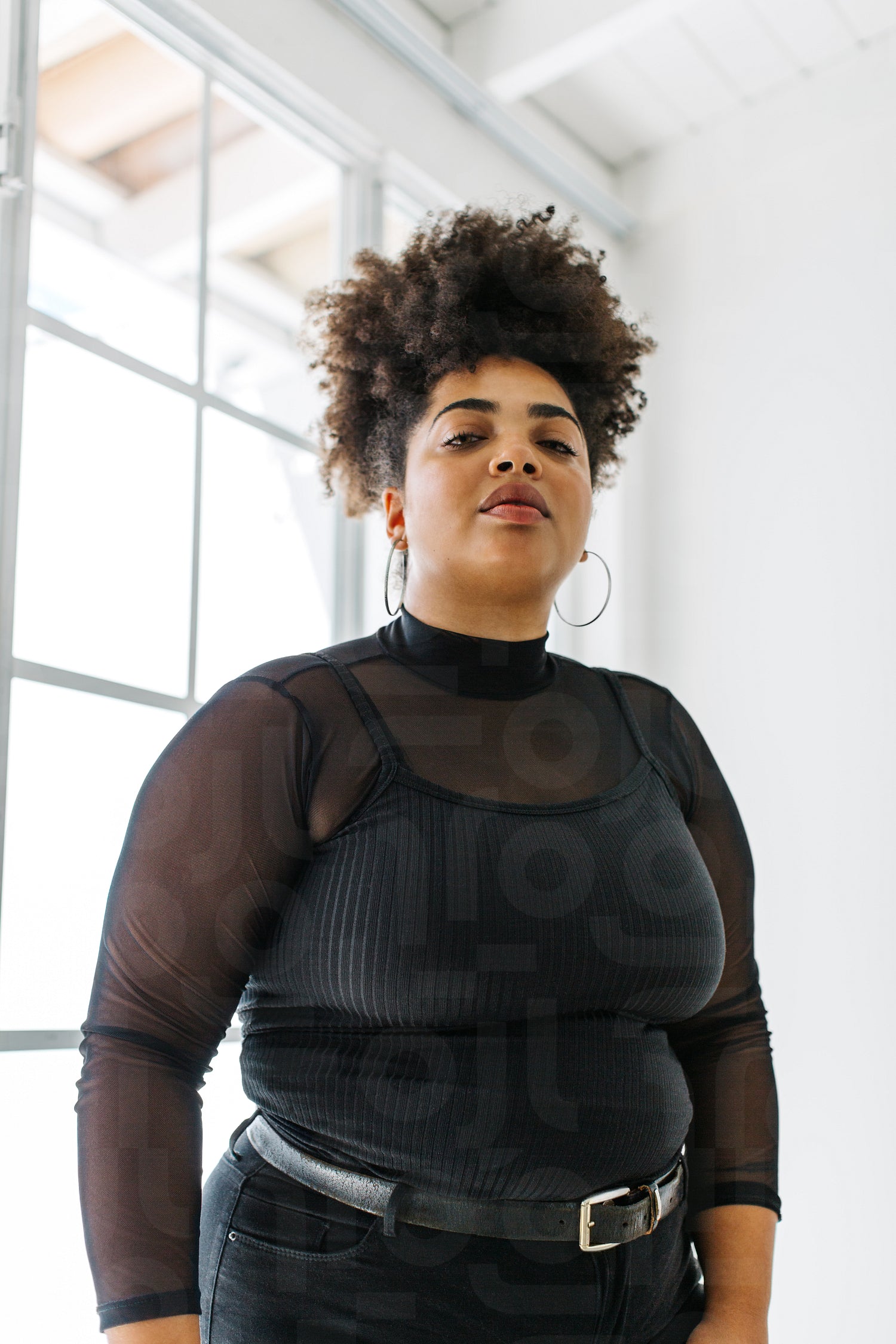 Plus size woman looking at camera while standing in living room. Pretty female in casual outfit standing near a window.