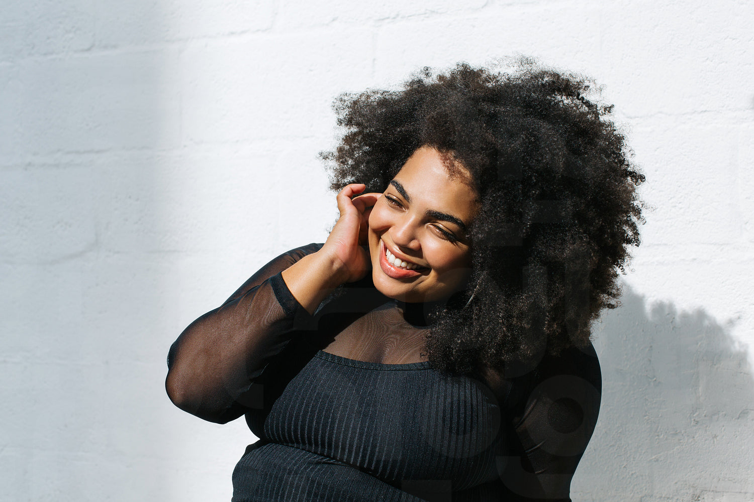Attractive woman in casuals standing near a wall. Female in fashionable outfit against white background.