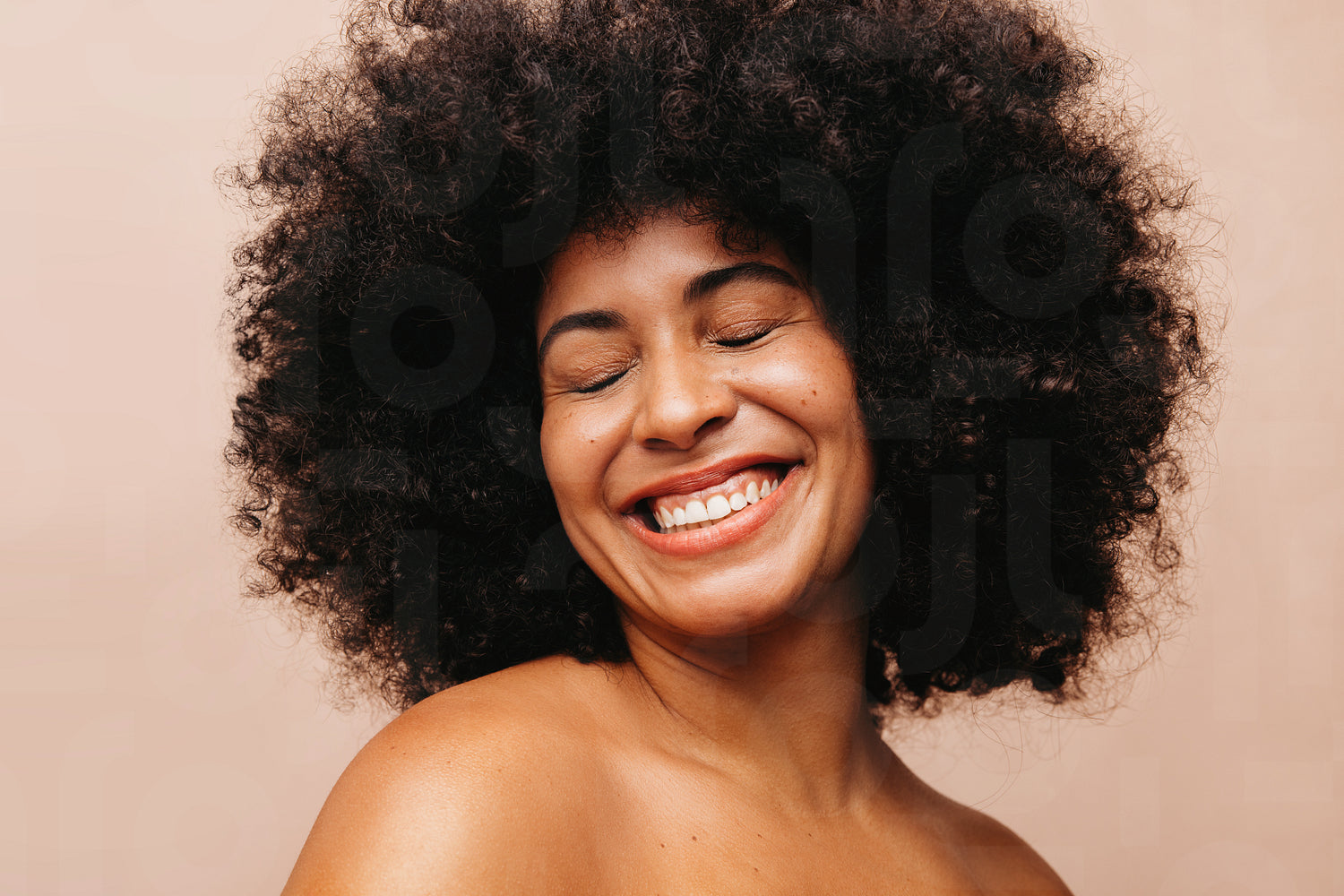 Attractive woman with an Afro hairstyle smiling cheerfully with her eyes closed. Gorgeous young woman of color wearing her natural curly hair with pride.