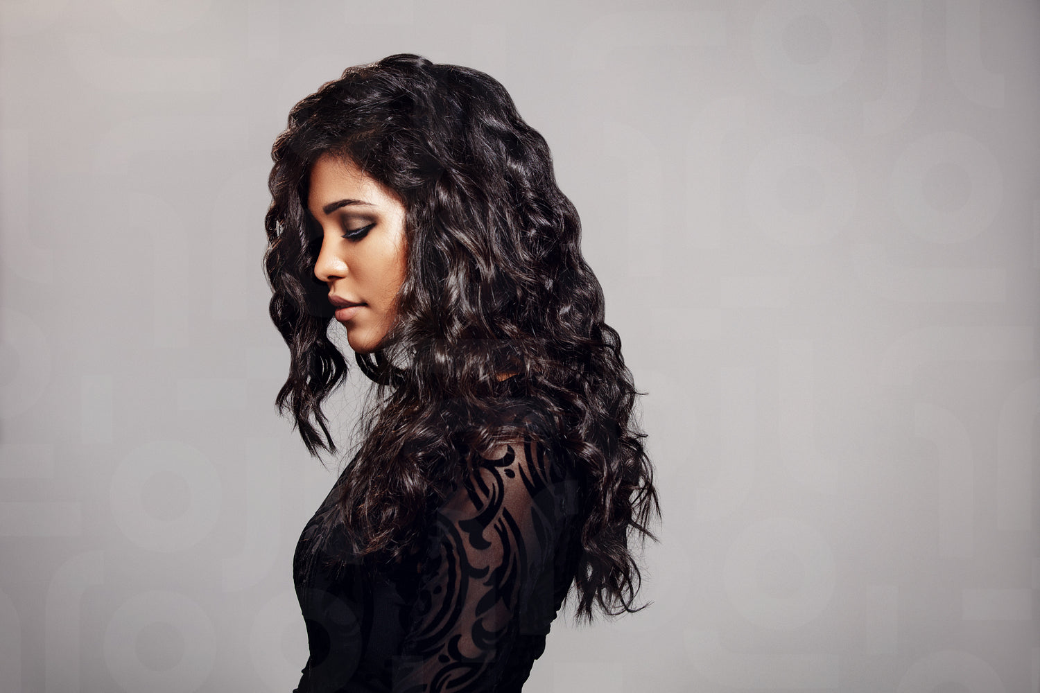 Side view of attractive young woman with curly hair standing against grey background. Beautiful female model in studio with copy space.