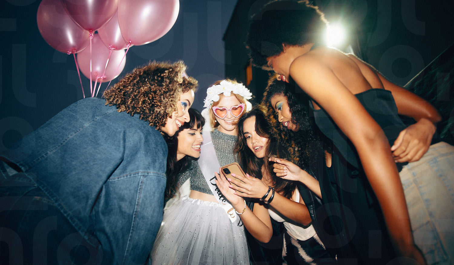 Friends gathered together celebrating a bachelorette party and sharing moments using a smartphone. A joyful occasion filled with laughter and camaraderie. Photo has intentional use of 35mm film grain.