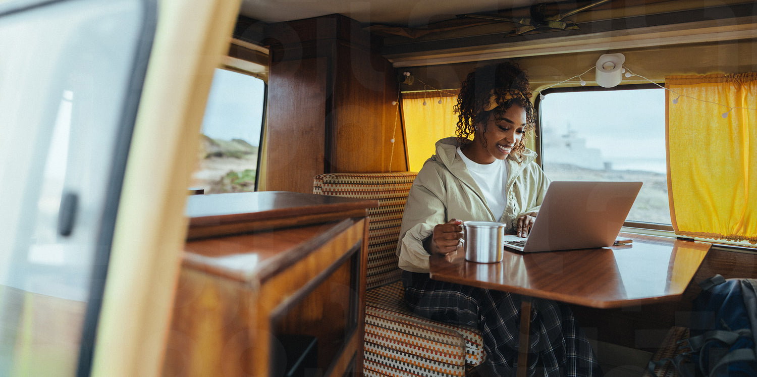 Balancing work and travel: Woman using laptop with a warm drink inside a camper van