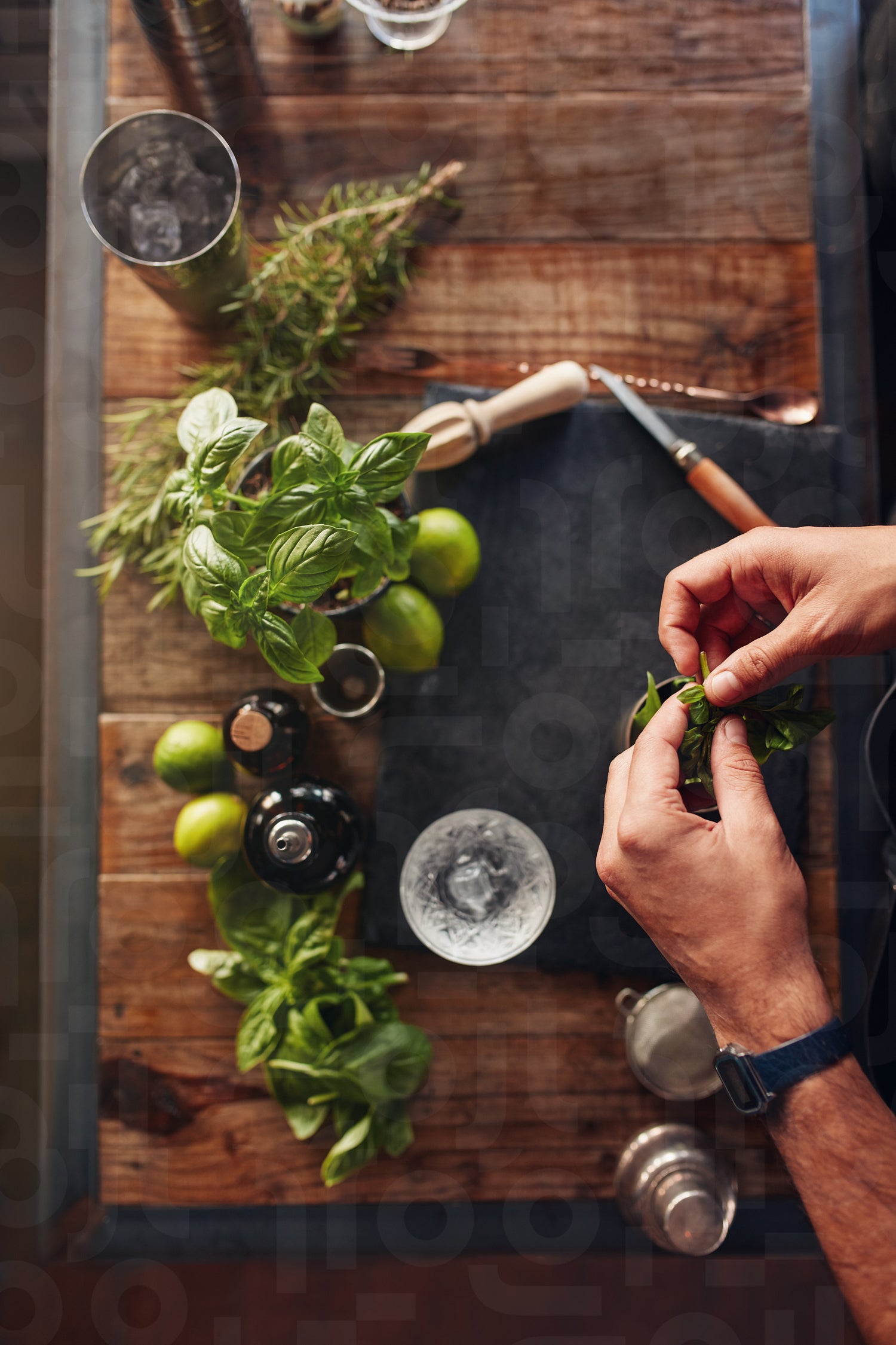 Set of bar accessories and ingredients for making a cocktail arranged on a wooden table with bartender hands working. Barman experimenting with creating new cocktail ideas.