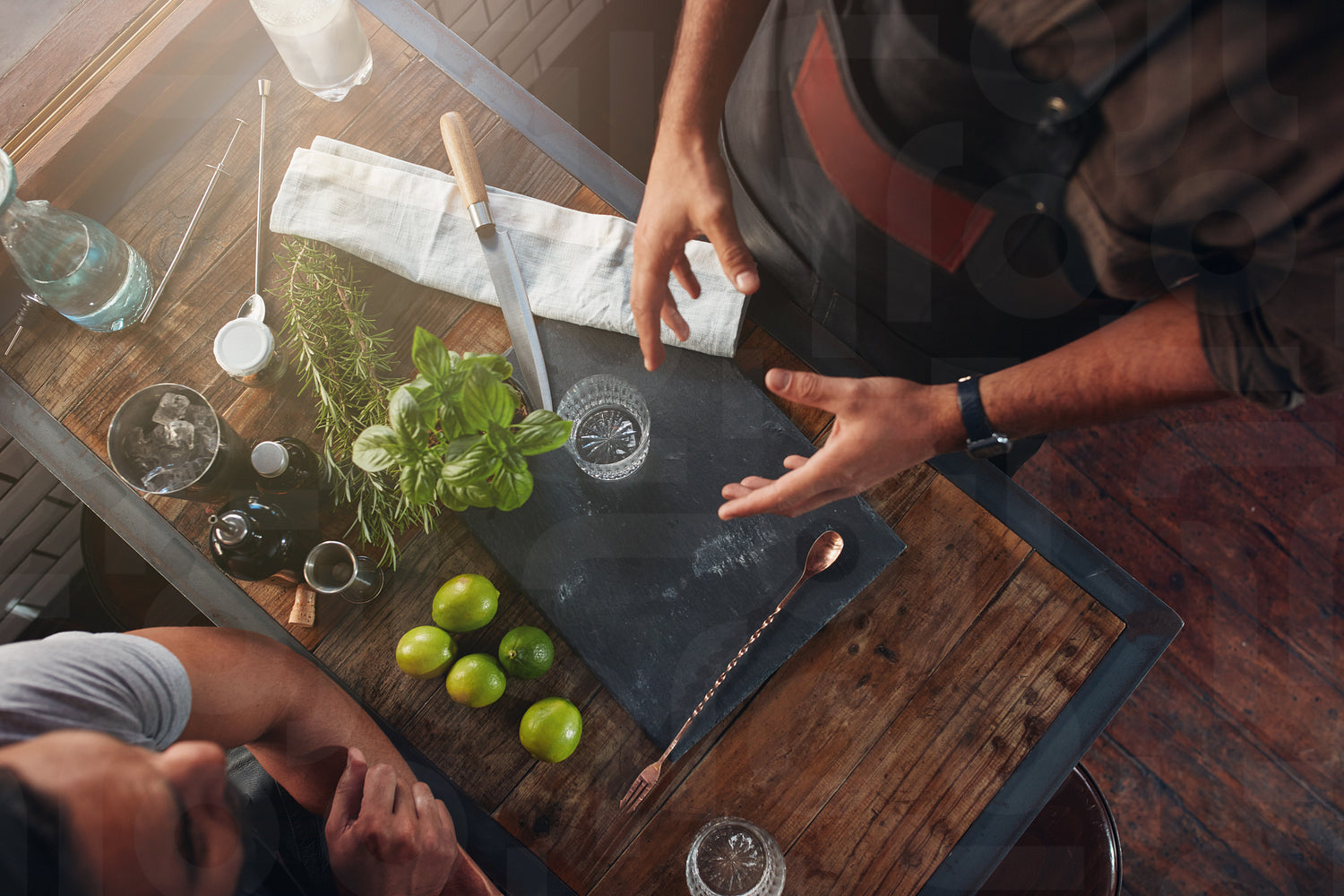 Top view to two bartenders discussing about new cocktail recipe with ingredients on the bar counter.