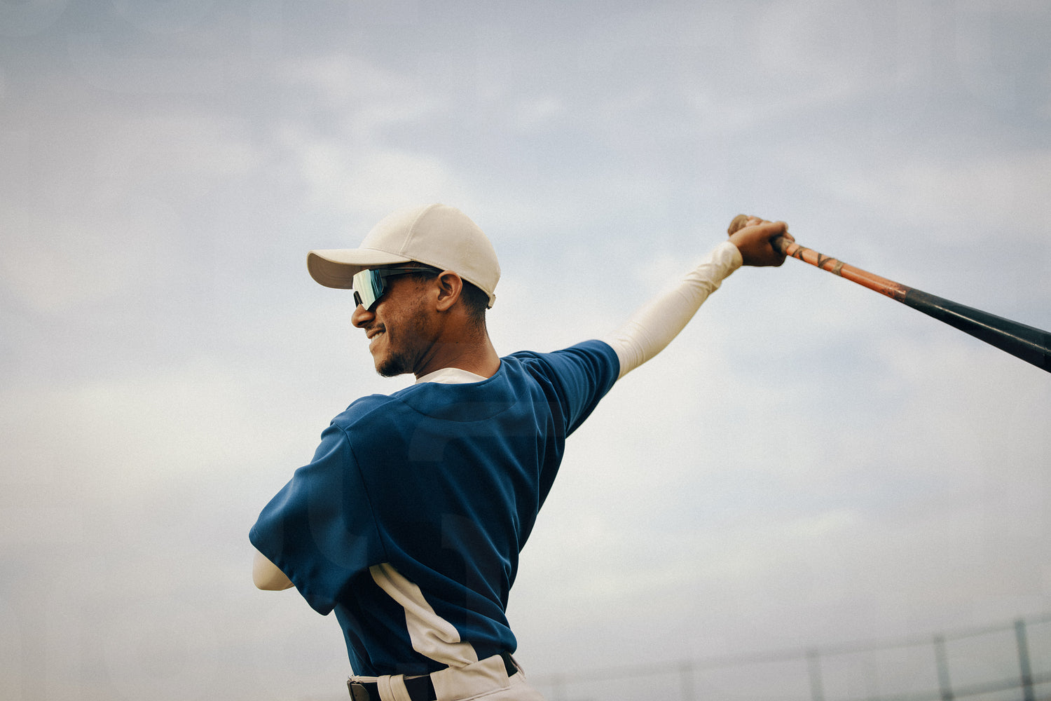 Baseball player in blue uniform preparing for a game with a confident smile on a sunny day