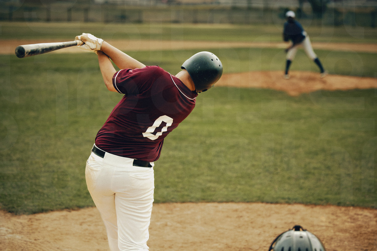 Baseball player wearing maroon jersey swinging bat during game in stadium
