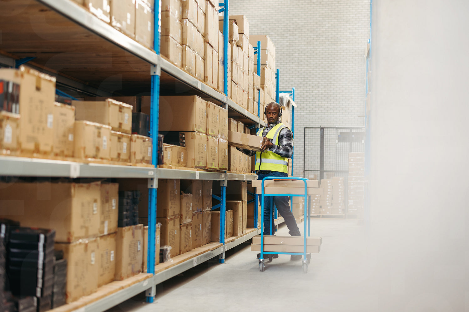 Batch picking using voice-picking technology. Warehouse worker pulling a flat box while receiving instructions from a warehouse management system. Logistics employee fulfilling orders with a headset.